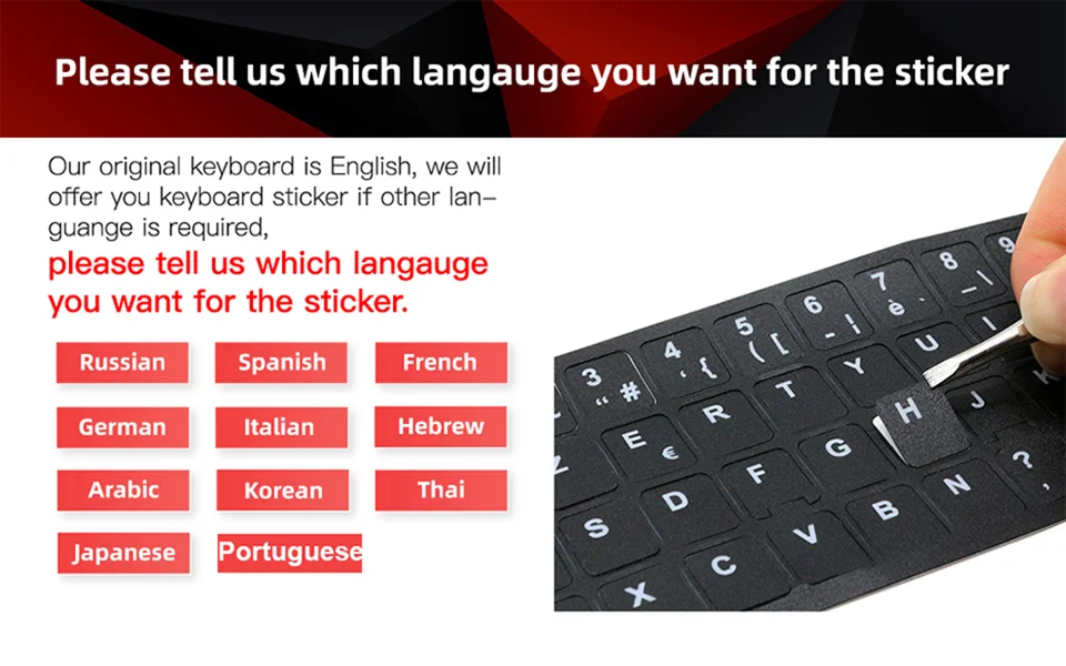 1. Please choose the correct plug type based on your country, and the keyboard language is English. We will send you keyboard stickers and plugs from the corresponding country according to the country where you placed the order.