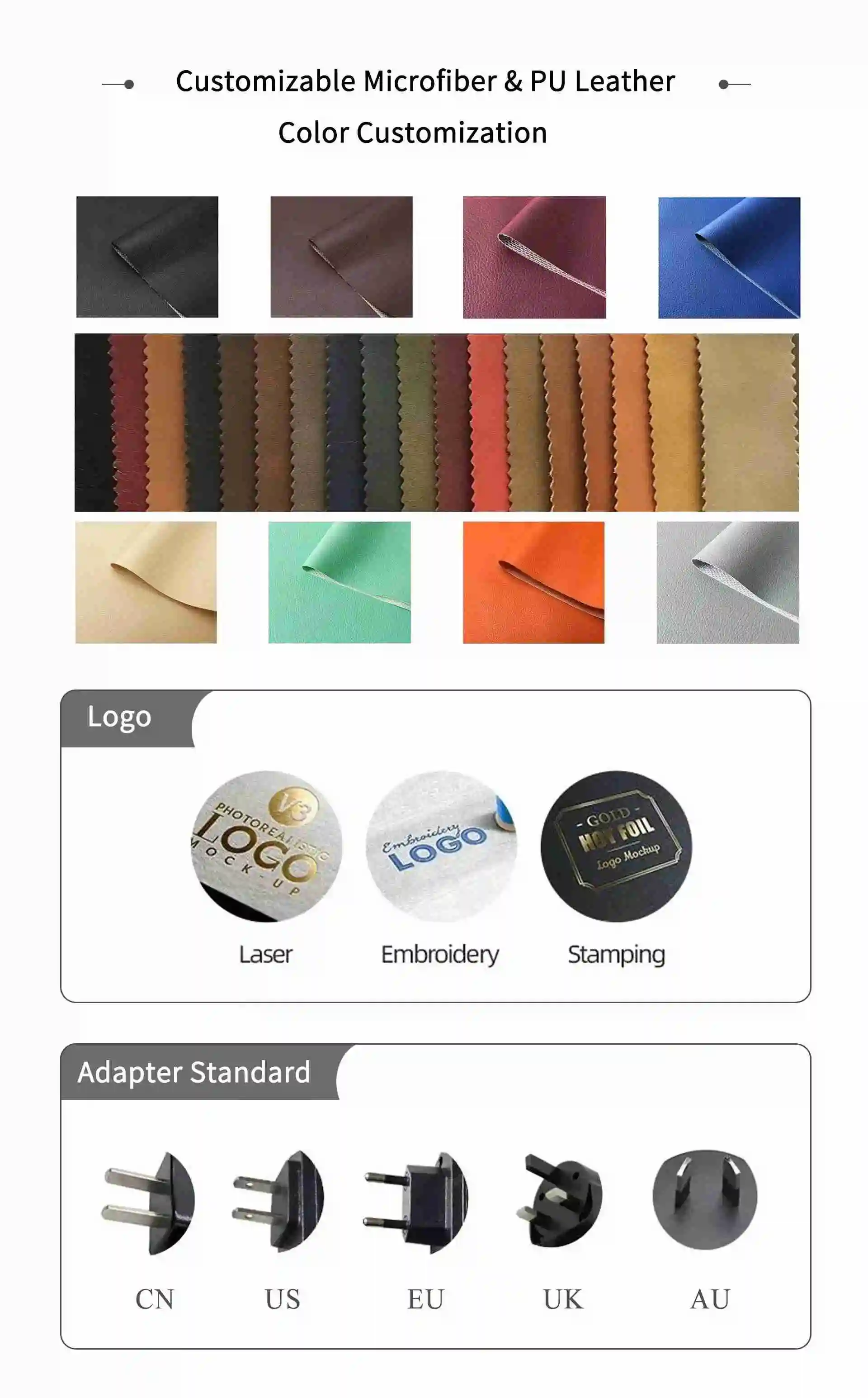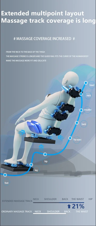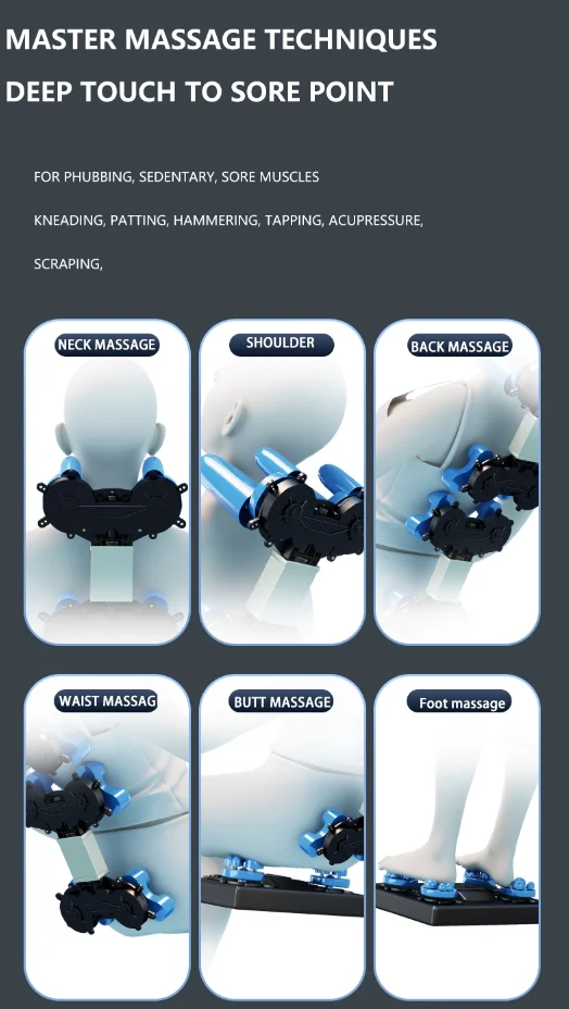 1. Two head pillows can be customized (air bag massage head U pillow + ordinary pillow) 2. Zero gravity design, massage Angle free adjustment 3. Touch screen large manual control (multiple massage modes are optional) 4. Massage your neck, back, and waist 5. Hip wheel/vibration massage 6. Massage your calves and back 7. Whole body balloon massage 8. Bluetooth can be customized 9. Automatic body shape self-fit detection