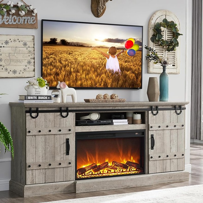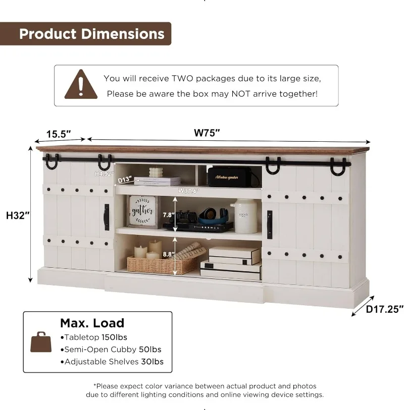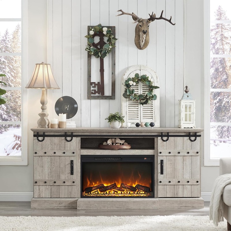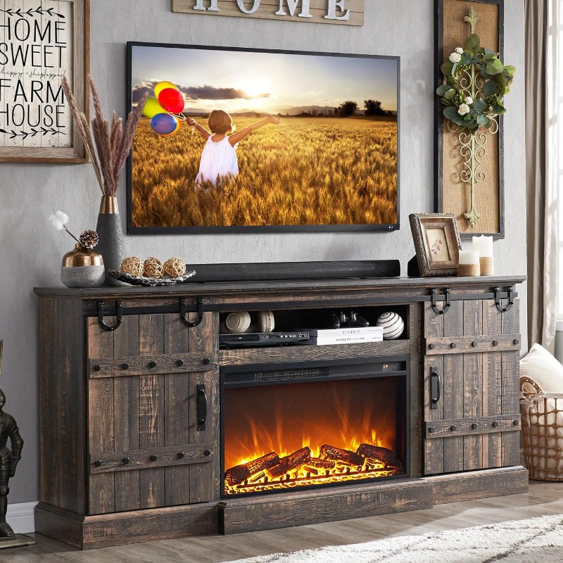 - Embrace Farmhouse Charm: 70"W x 32"H x 17"D, fits flat/curved TVs up to 80''. The 30'' electric fireplace features a bigger screen showcasing realistic flame for enhanced visual enjoyment. The table combines a two-tone distressed finish, delivering a naturally aged feel and creating a cozy and retro feel. Enhancing its charm: sliding barn doors with unique metal hex nail design. It will be sent out in 2 separate parcels due to large size and arrive at you on different days.