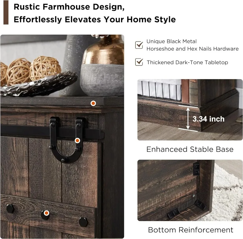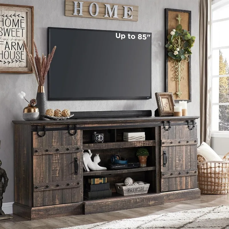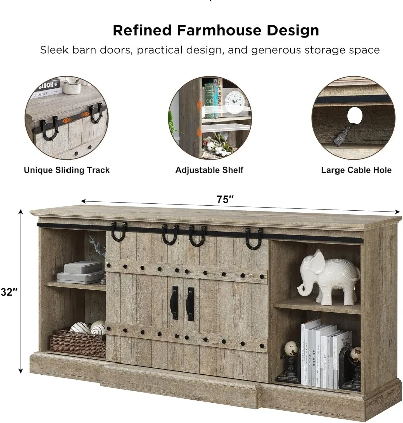 - Ample Adjustable Storage Space: Each cabinet has one shelf adjustable with 3 heights to fit for items with different sizes, providing customizable organization for media, electronics, accessories, books, or decor. Three pre-punched cable holes help keep wires tidy. Sliding barn doors for convenient access to cabinets while space saving. You can slide the door to any side for a clean, organized look.