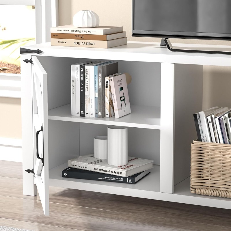 - 【Eye-Catching Farmhouse Style】The entertainment center is designed with a classical and rustic appearance. Farmhouse barn doors with black corner decorations adds a retro touch with traditional functionality. Overall dimension: 69.9″ L × 15.7″ W × 23.2″H.