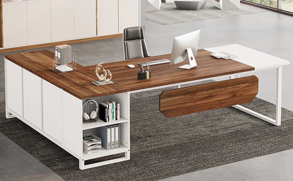 Executive desk offers a spacious tabletop that provides an enough space for: multiple monitors, notepads, folders organizers and some decor.