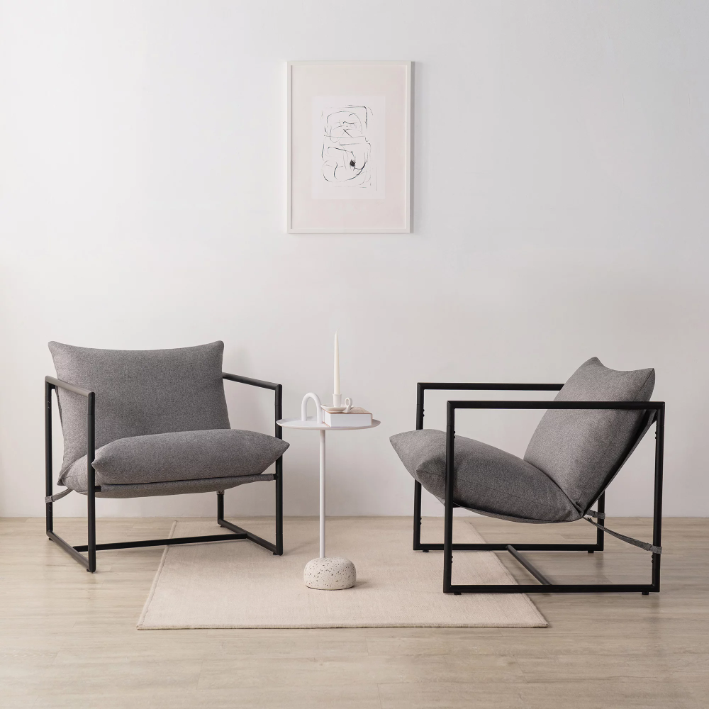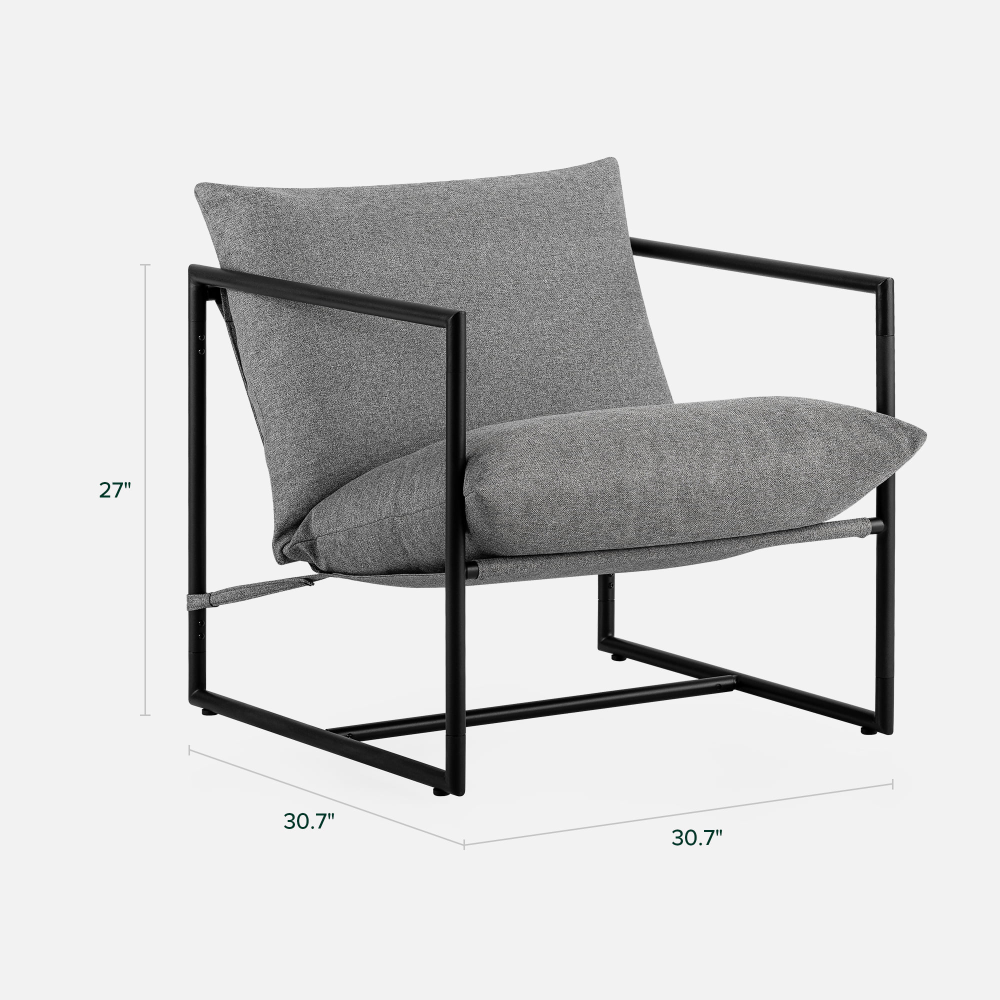 The Aidan Sling Chair makes a cool and comfy accent piece for any room of your home. Its square-shaped steel frame gives it a versatile modern look. It is available in a variety of upholstery colors. Textured fabric cushions with shredded foam will keep you comfortably seated for hours. Its wide seat is designed to give you plenty of room. A sturdy steel frame is built to support up to 250 lbs so you can relax carefree. This chair ships to your door in one compact box with all parts, tools, and instructions. In under 30 minutes, you can assemble it stress-free. Whether using it to curl up with a good book or catch up with friends, the Aidan Sling Chair creates the comfy, contemporary atmosphere you're looking for.