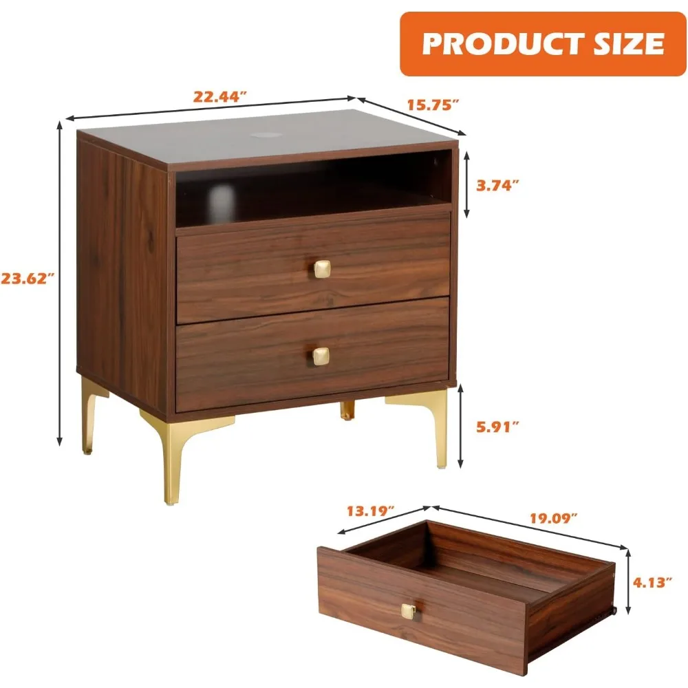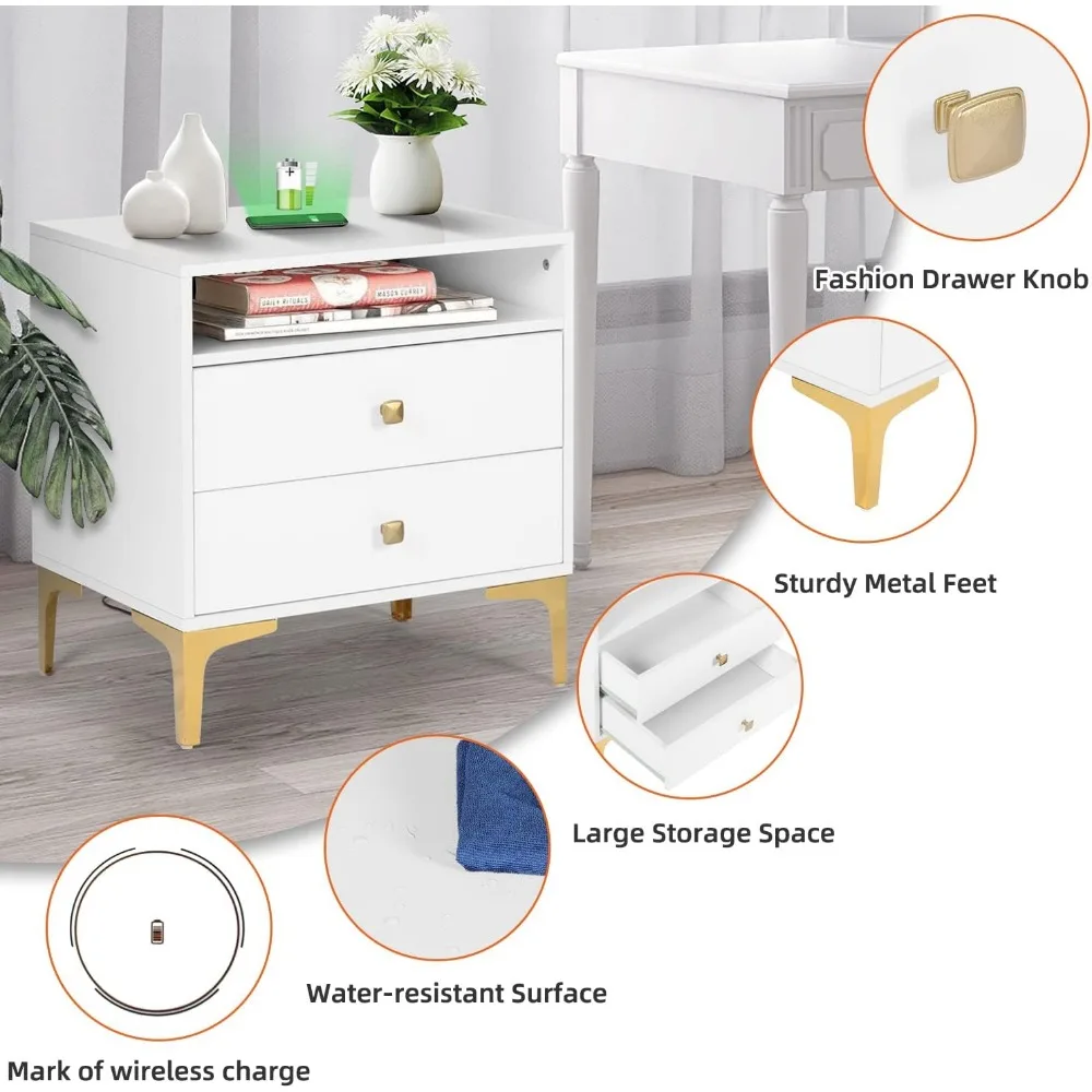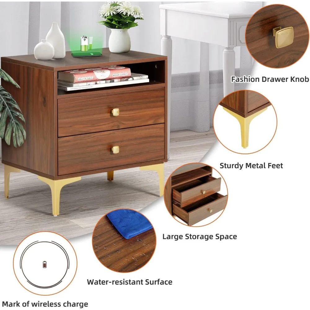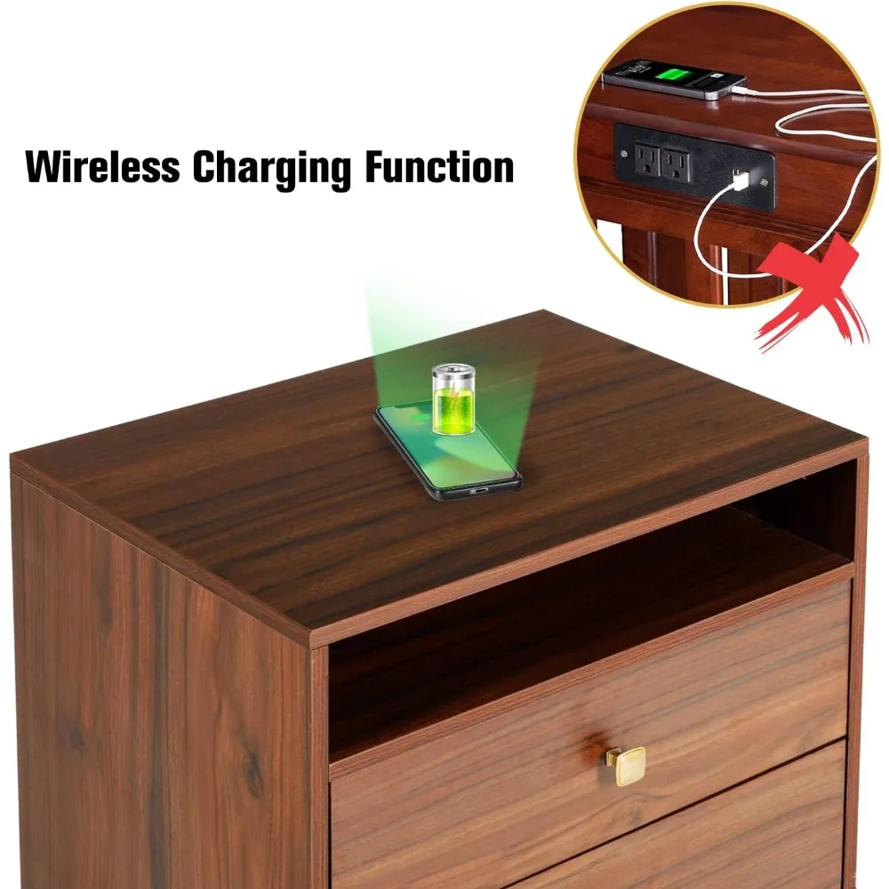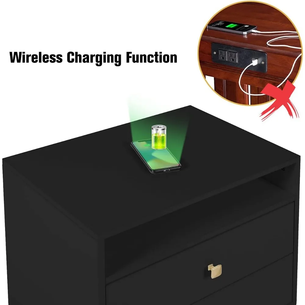 AILEEKISS Nightstands Set of 2 with Wireless Charging Function Wooden Night Stands 2 Sets with Drawers and Open Shelf