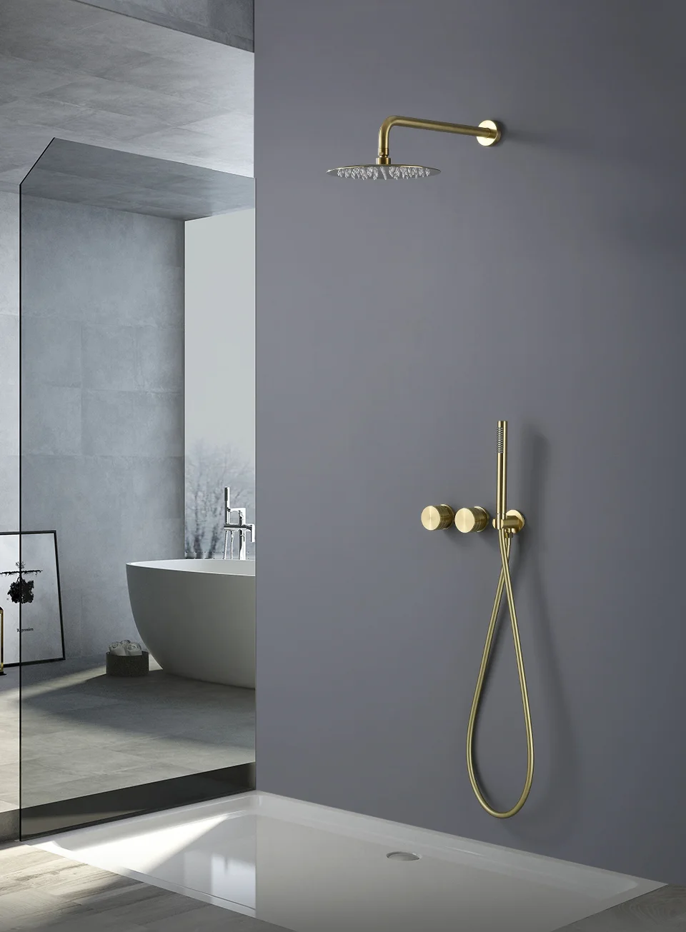 Bathroom Shower System Set Brushed Gold Hot Cold Faucet Bath Mixer Tap Brass Diverter Handheld Rainfall Head Ceiling Arm Kit