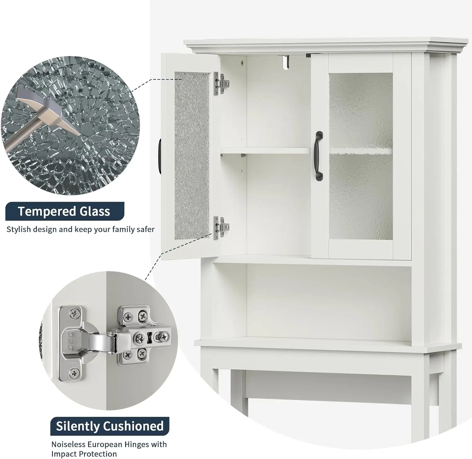 🚽【Sturdy & Stability】This over the toilet cabinet is made of MDF and hammered grain art glass, the craftsmanship of spray paint coating complements the simple tone of the shelf and cabinet, creating a transitional look. In addition, this behind the toilet organizer cabinet is equipped with anti-toppling accessories that enhance stability and secure your safety in daily use.