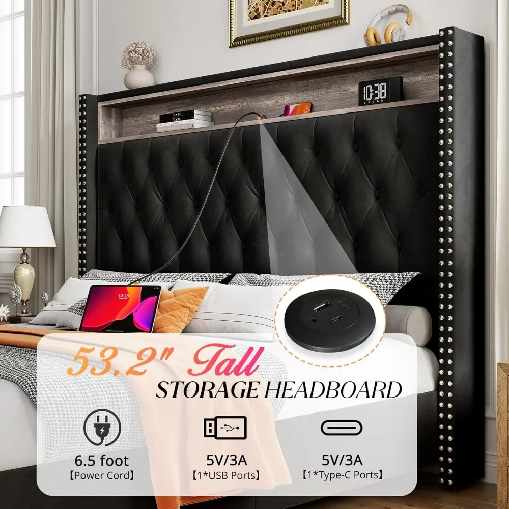 - King Bed Frame Tall Headboard: Extra tall 53.2" button tufted,nailhead trim wingback headboard with velvet upholstery makes your bed the centerpiece of bedroom, providing much more comfortable support.