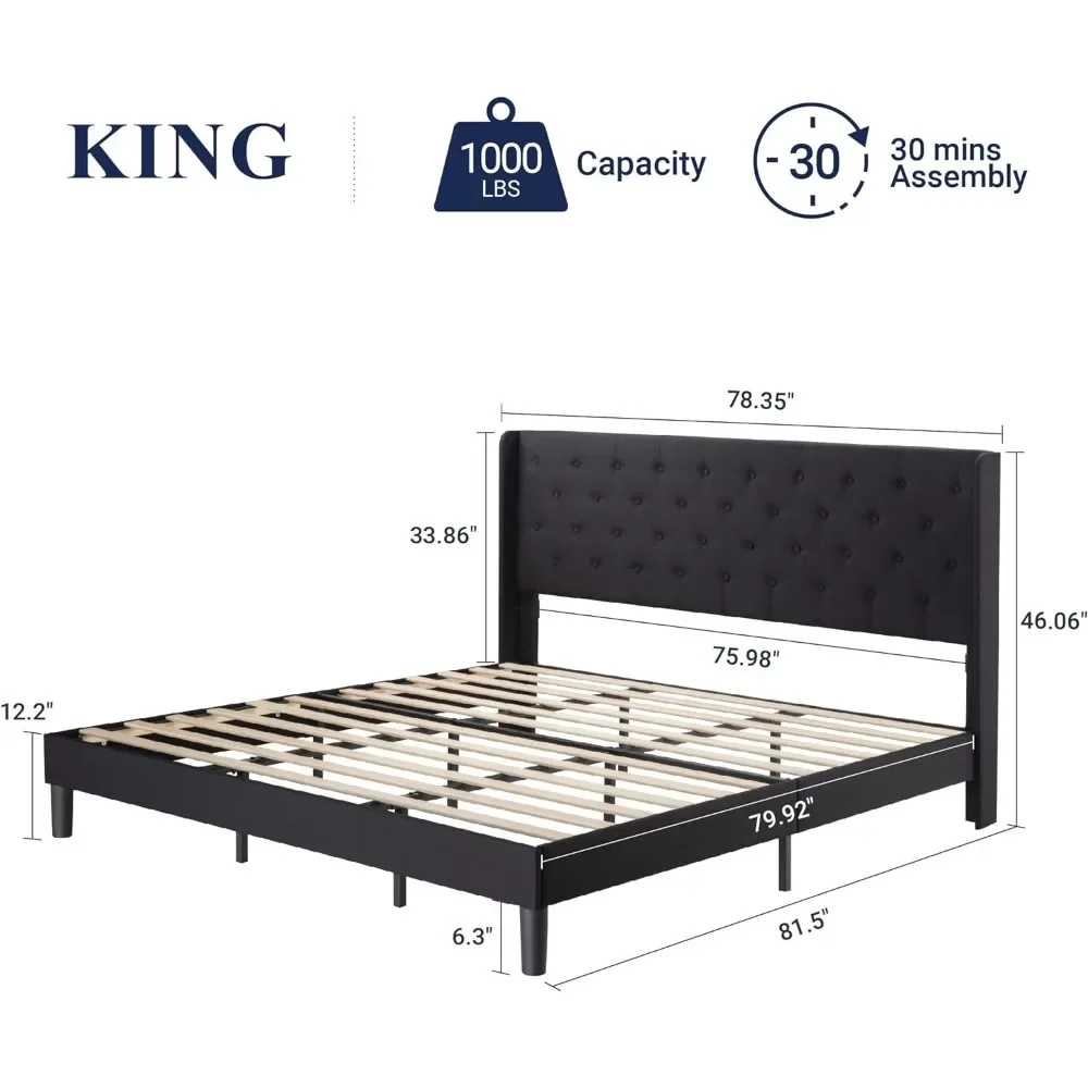 - MODERN UPHOLSTERED PLATFORM BED: Exquisite button tufted headboard with wingback design can match a variety of bedroom styles perfectly. The fabric material has strong breathability and brings you a skin-friendly touch.