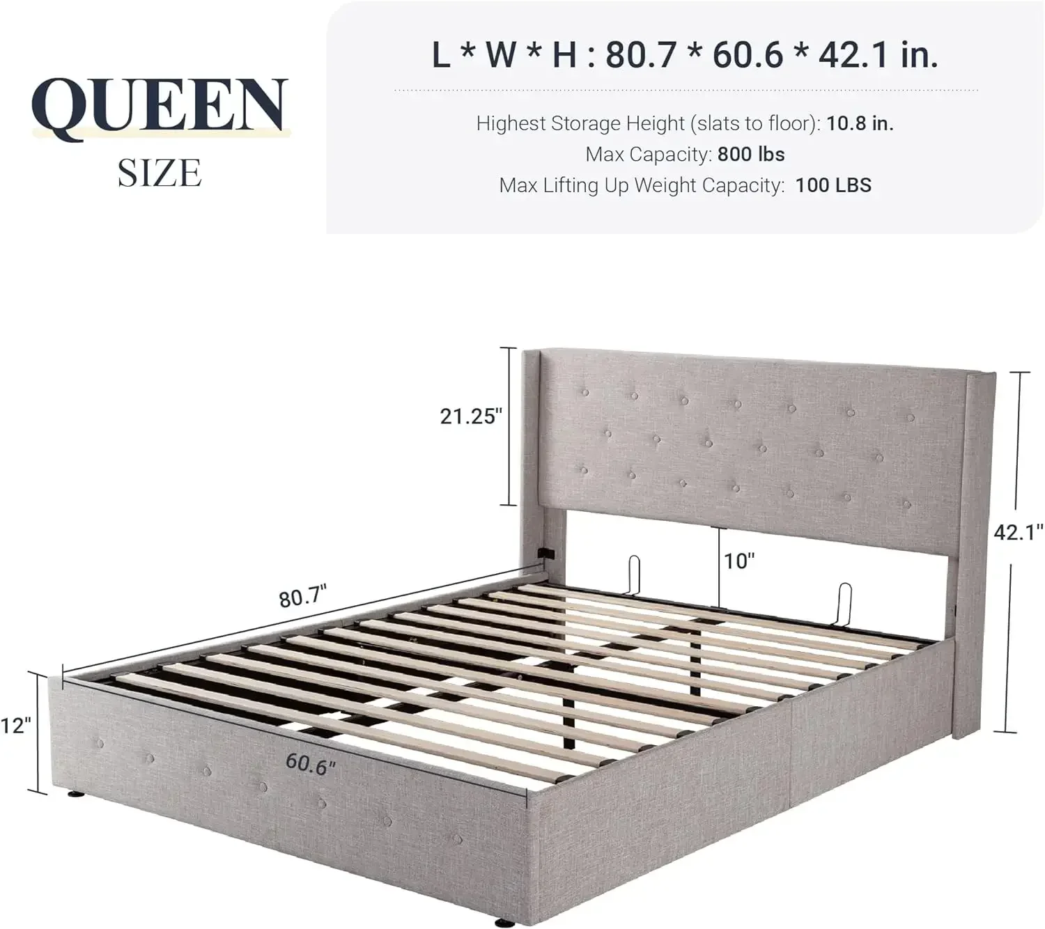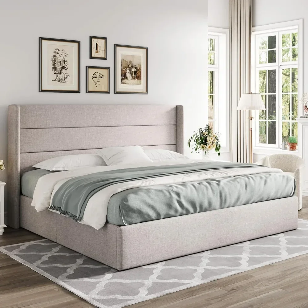 Bed FrameLarge Lift Storage Bed, Modern Wingback Headboard, No Springs Required, Easy To Assemble, Hydraulic Storage
