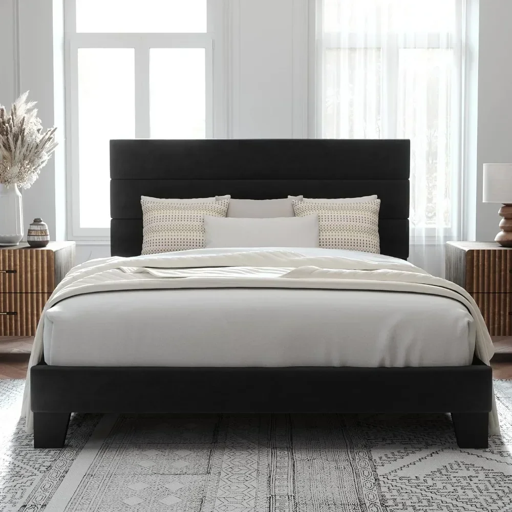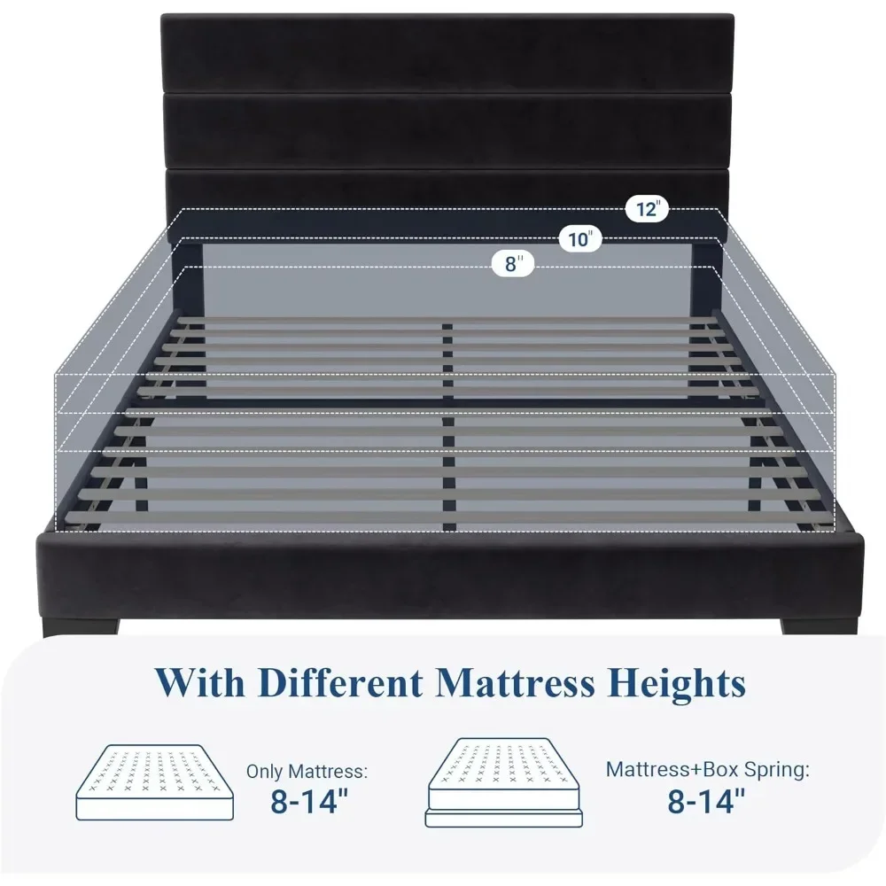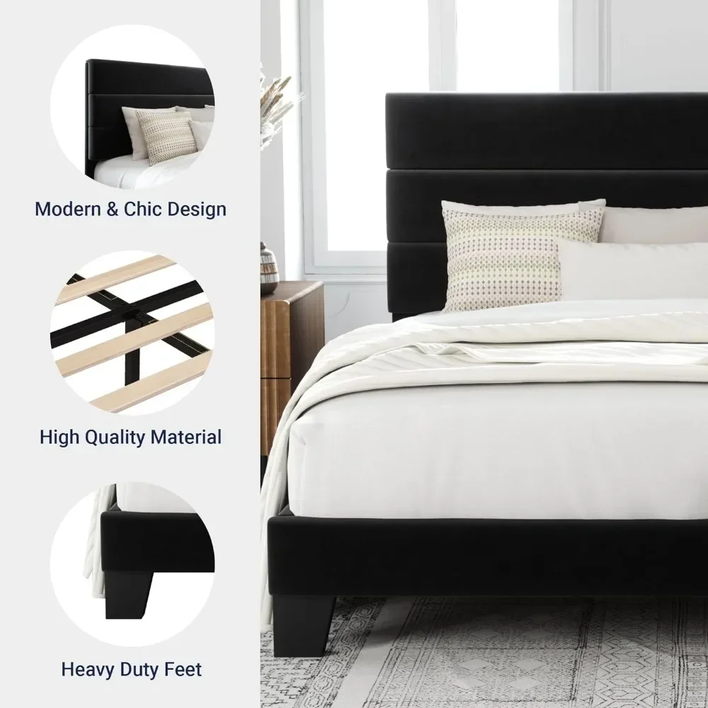 Bed FrameQueen-size Platform Bed Frame With Velvet Upholstered Headboard And Wooden Slatted Support, Fully Upholstered