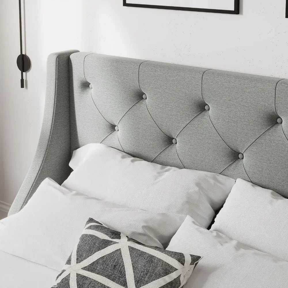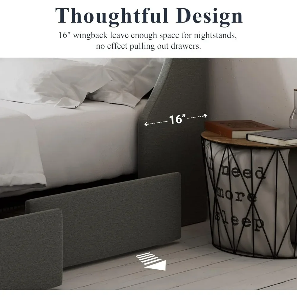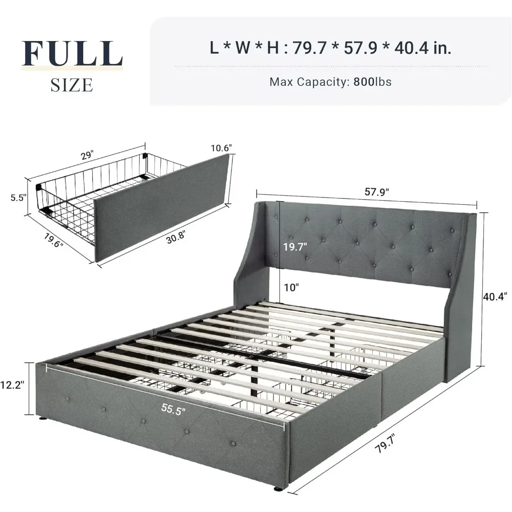 Bedroom furniture: full-size bed frame with 4 storage drawers and wing-back headboard, button tufted design, light grey