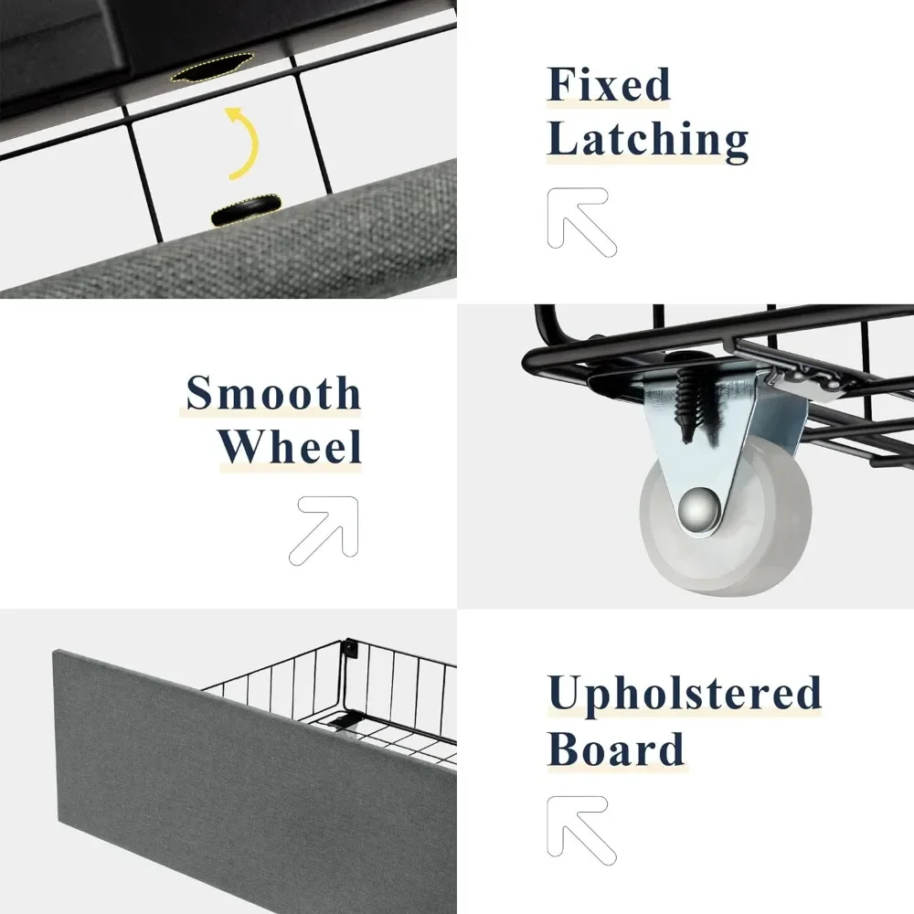 - Upholstered Bed with Drawer: Four invisible under-bed storage drawers with wheels, still maintain a fashionable appearance, no more worry about crowded closets.