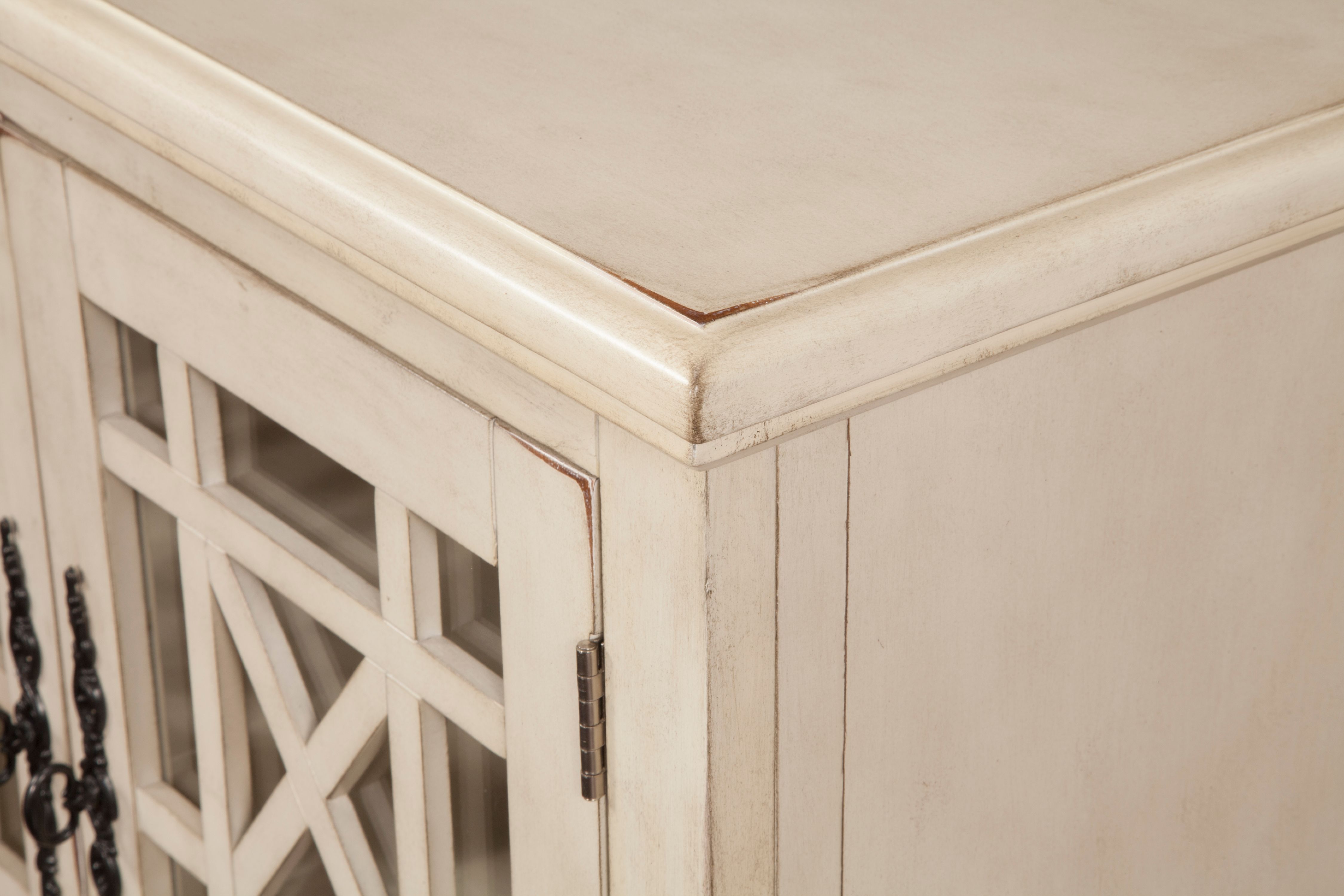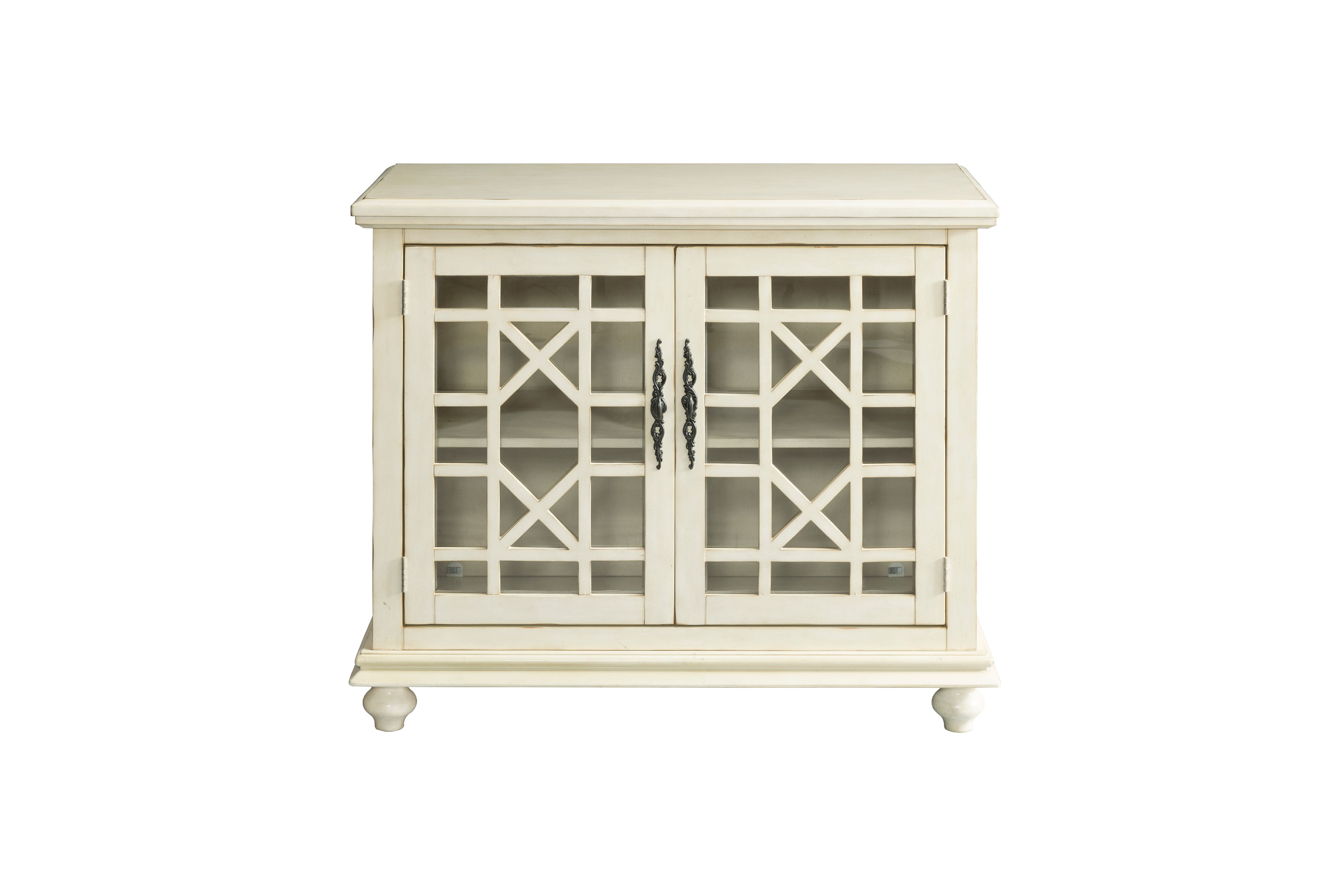 Don't need a television that takes up an entire wall? The Orsey Small Spaces 38 in. TV Stand - Antique White is right there with you. An ideal option for more modest TVs, this stand features a double-door cabinet in the base for all your storage needs. The cabinet is outfitted with an adjustable shelf and vented backing. Each door has a clear glass backing panel and a geometric trellis slat design. The wood comes finished in creamy antique white.
