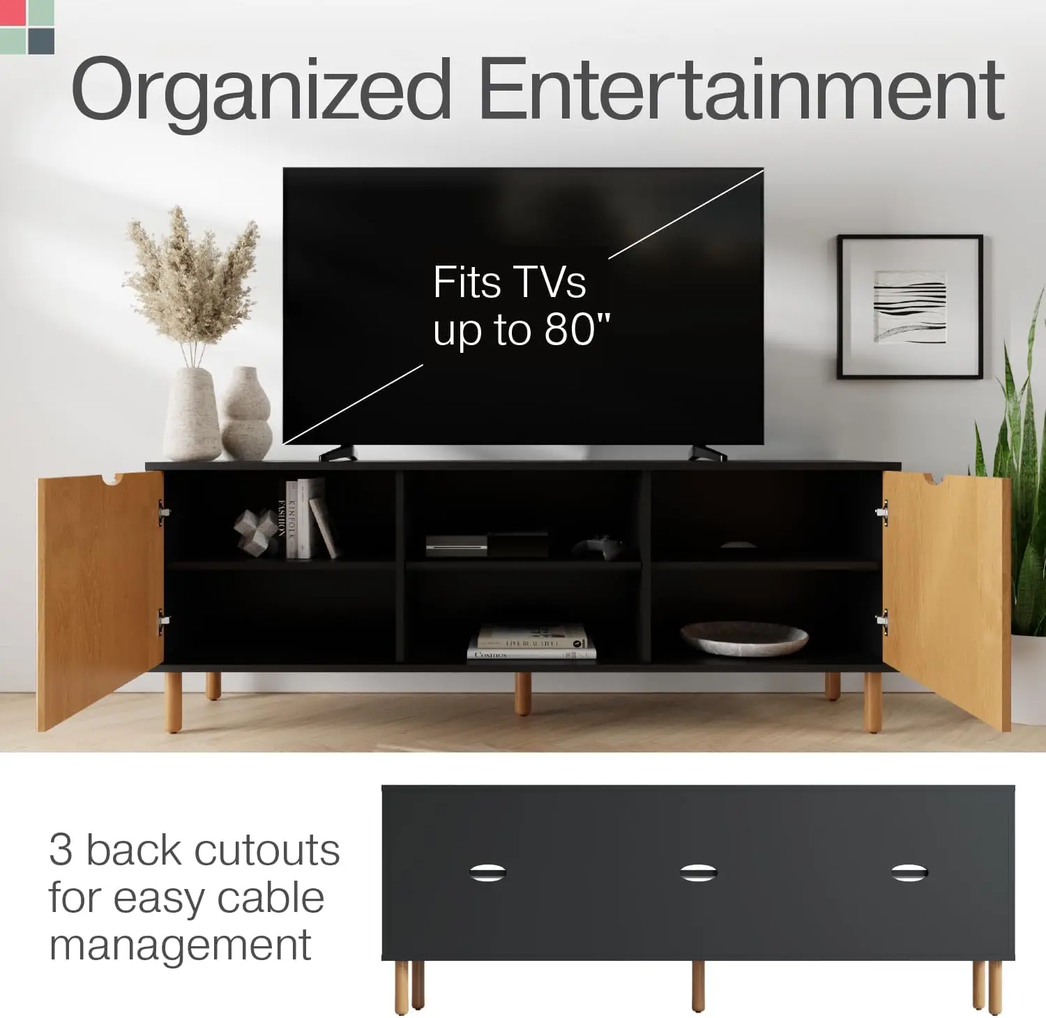 - Living Room Furniture - Place the wood tv stand in your living room to display your television while storing media consoles, records, books, and more inside the cabinets; the back panel features 3 cord hole cutouts to organize and manage loose cables and wires easily