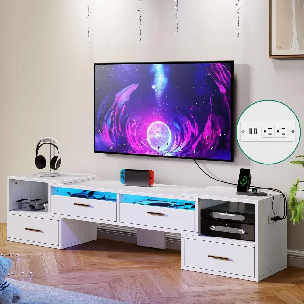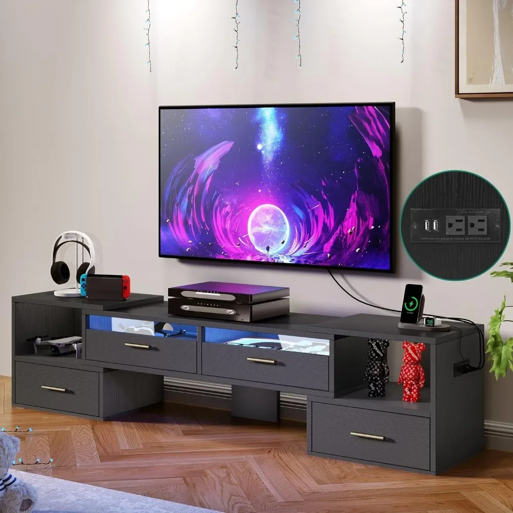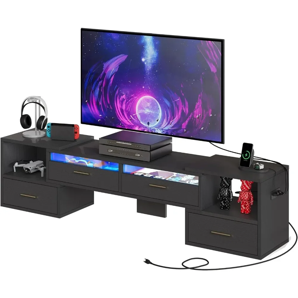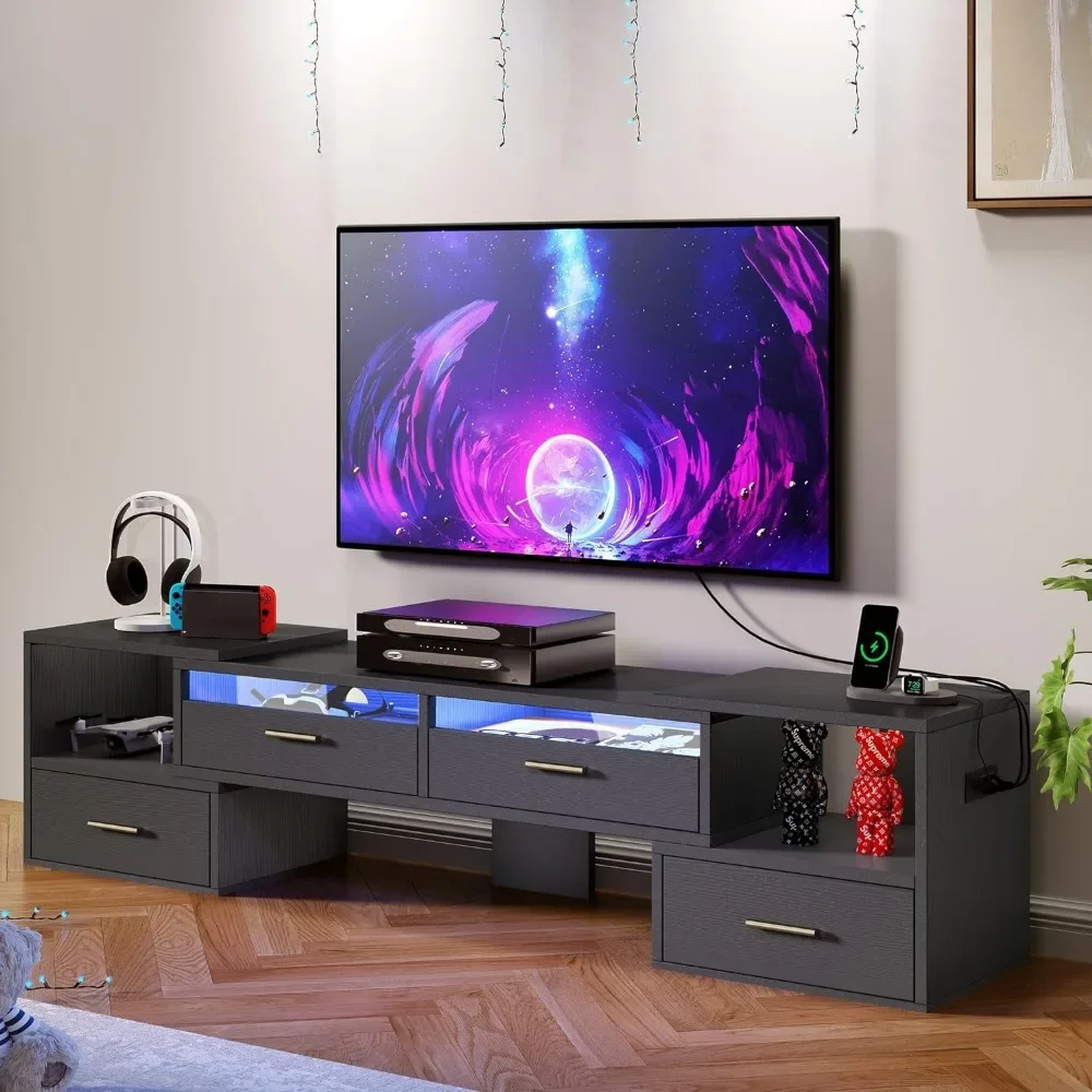 - Large Storage Space & Sturdy Wooden TV Console Table for 300lbs : Modern TV stand for 45 ~ 75 inch tvs, made of durable P2 MDF allows for years of enjoyment. The media stand is featured with 4 drawers and 2 open storage shelves, which are great for your gaming devices, PS5, Switch, DVDs, speakers, family photos, and books. Display or keep your things in organized. Hollow Back help the easy organization and hiding wires
