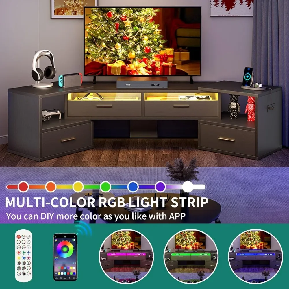 - Musical Rhythm RGB LED TV Stand:entertainment center with remote control LED lights can create great entertainment atmosphere both day and night. 6 colors of static mode, 2 musical modes, 1 lock mode w/ timer. You can choose more colors and modes according to your preferences by APP or remote control, enhancing the festive atmosphere during Christmas, Halloween and other major holidays