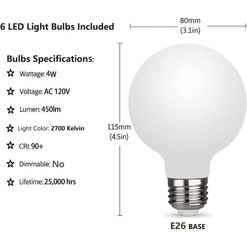- 6 LED light bulbs included. The bulbs are 5 watts each,2700 kelvin lighting color.