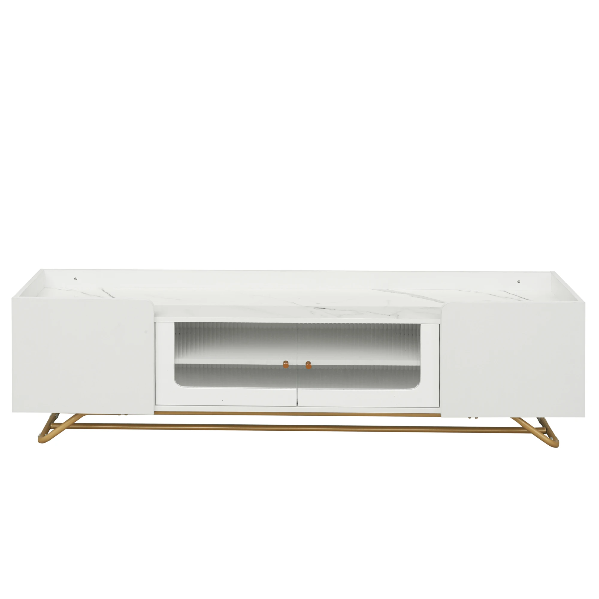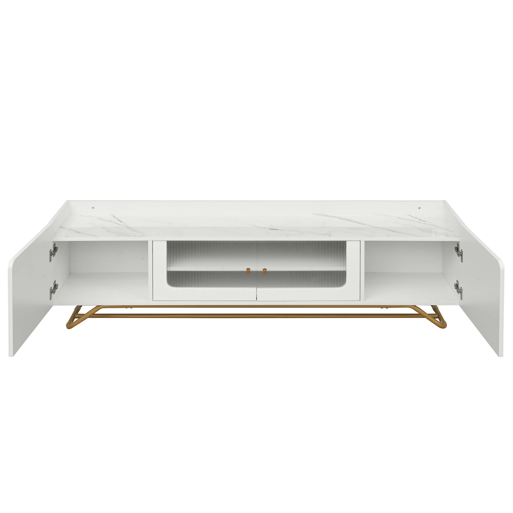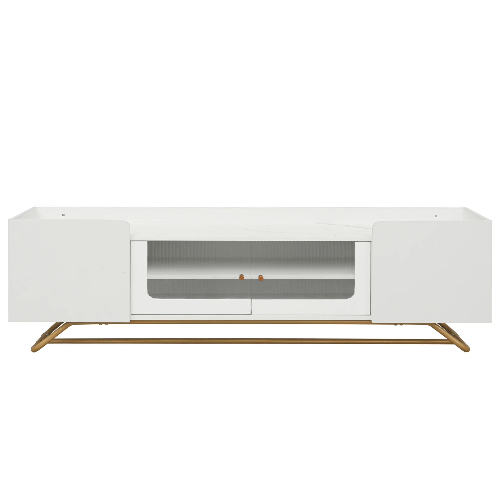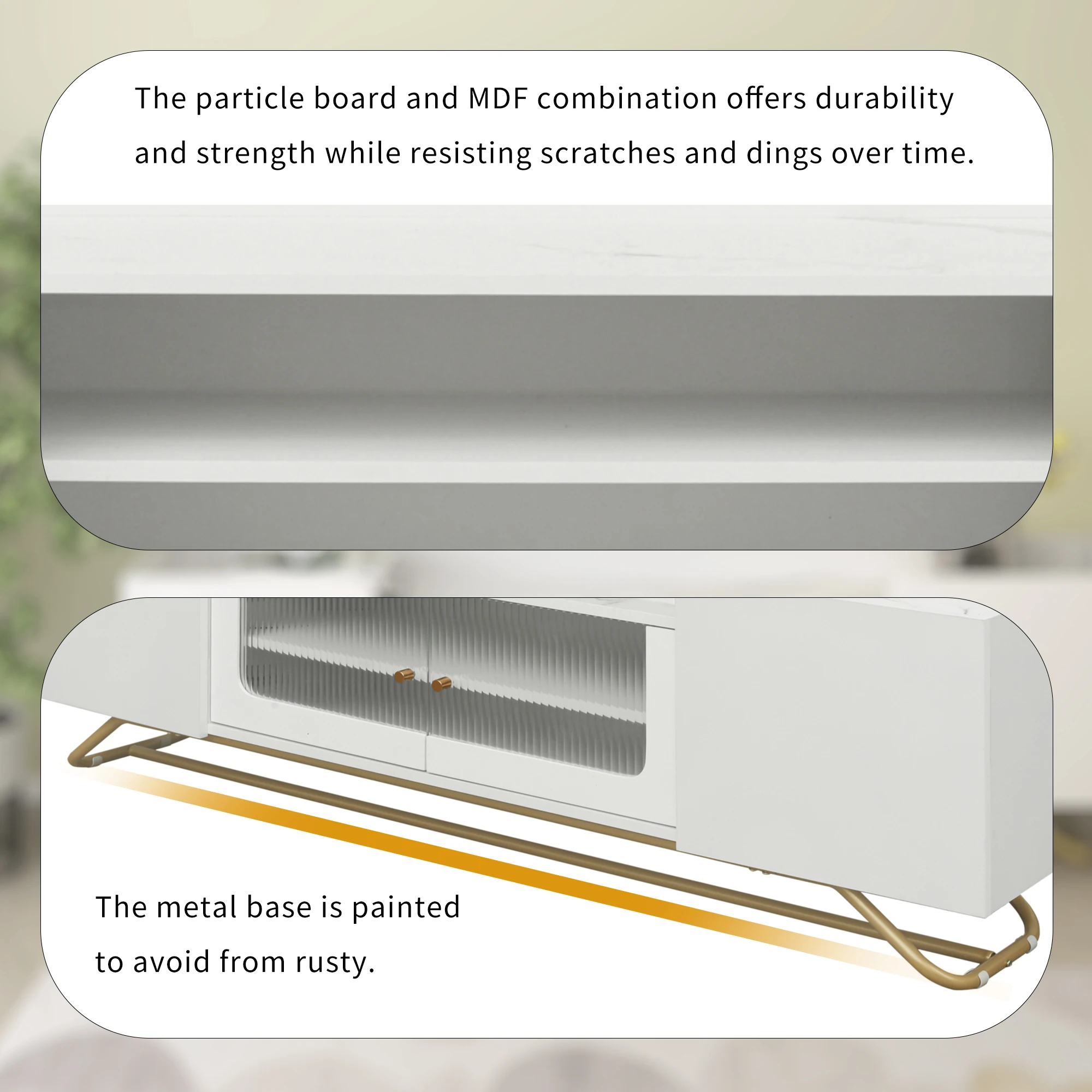 Fluted Glass Doors: The standout feature of this TV stand is the central cabinet, the fluted glass doors with metal handles offer a unique visual appeal, drawing attention and providing an element of privacy. Additionally, the fluted glass surfaces are easy to clean and maintain over time.