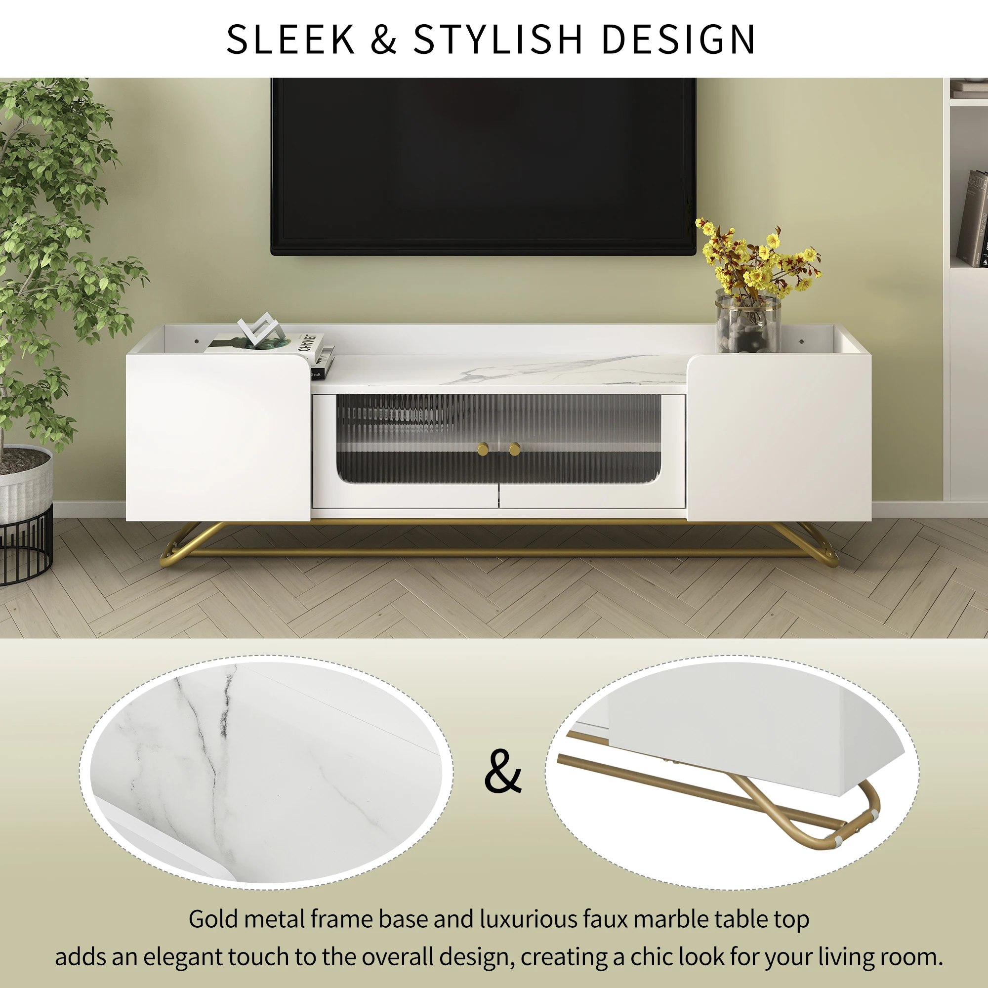 Sleek & Stylish Design: This TV stand features a gold metal frame base and luxurious faux marble table top that adds an elegant touch to the overall design, creating a chic look for your living room.