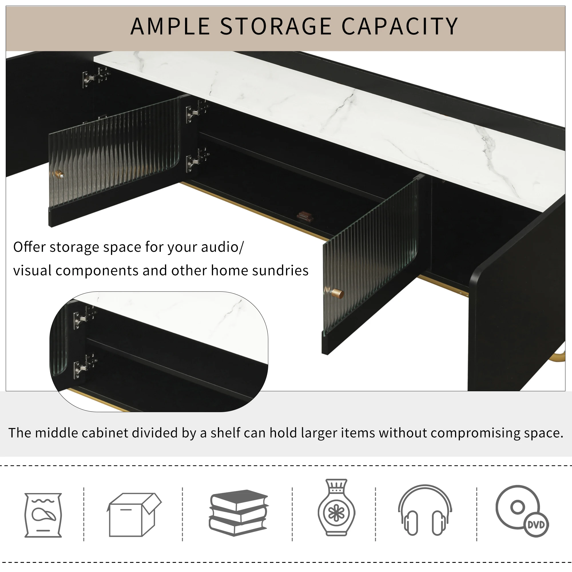 Ample Storage Capacity: The spacious cabinets offer storage space for your audio/visual components and other home sundries. The middle cabinet divided by a shelf can hold larger items without compromising space, allowing you to easily organize and access your items.