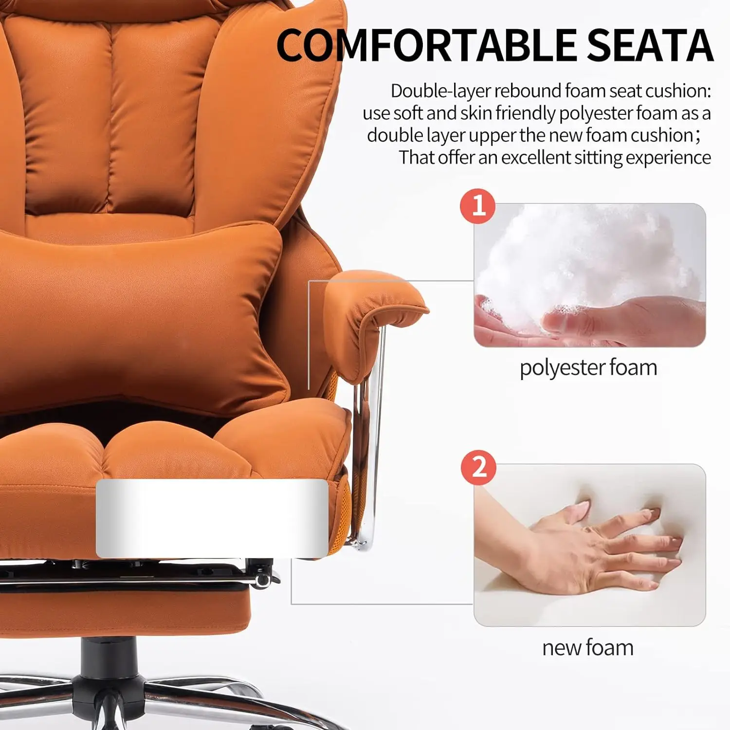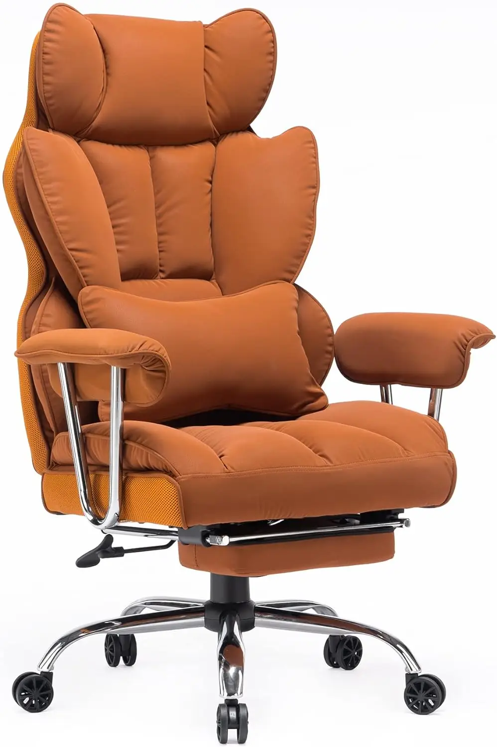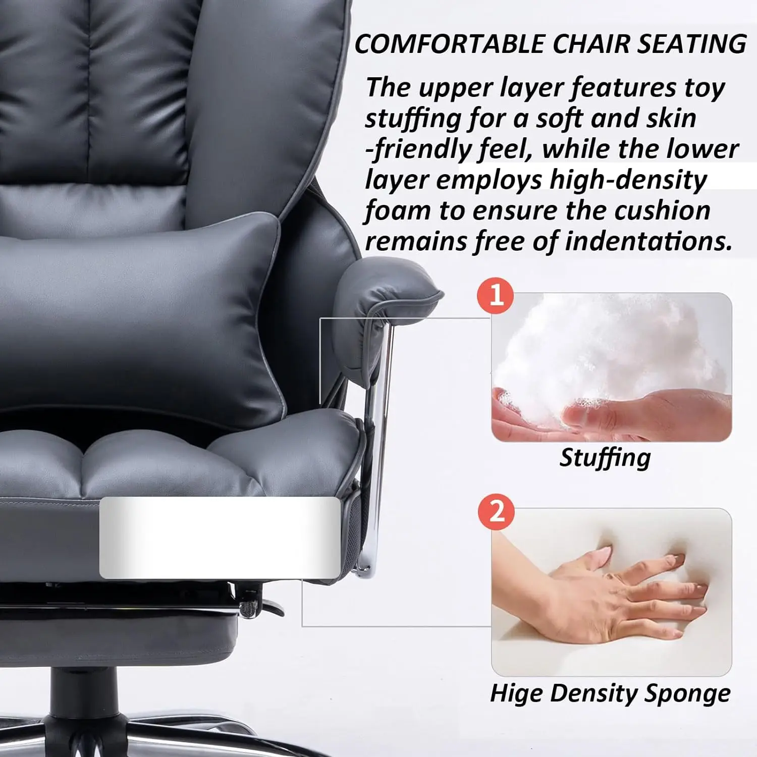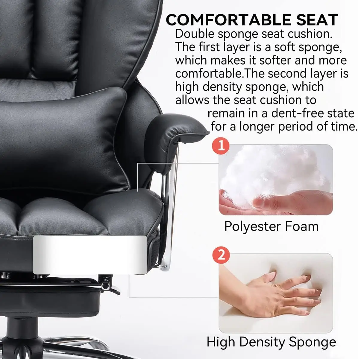 - COMFORTABLE OFFICE CHAIR - The ergonomic office chair equip a dual-layered sponge seat cushion. The big office chair backrest and independent lumbar support gently wrap around your body ,support your lower back, thoughtfully designed for the big and tall office chair to keep you comfortable during long hours of working, studying, or gaming. The leather office chair provides unparalleled comfort. Moreover, this executive chair with leg rest adds an extra dimension of relaxation to your workspace