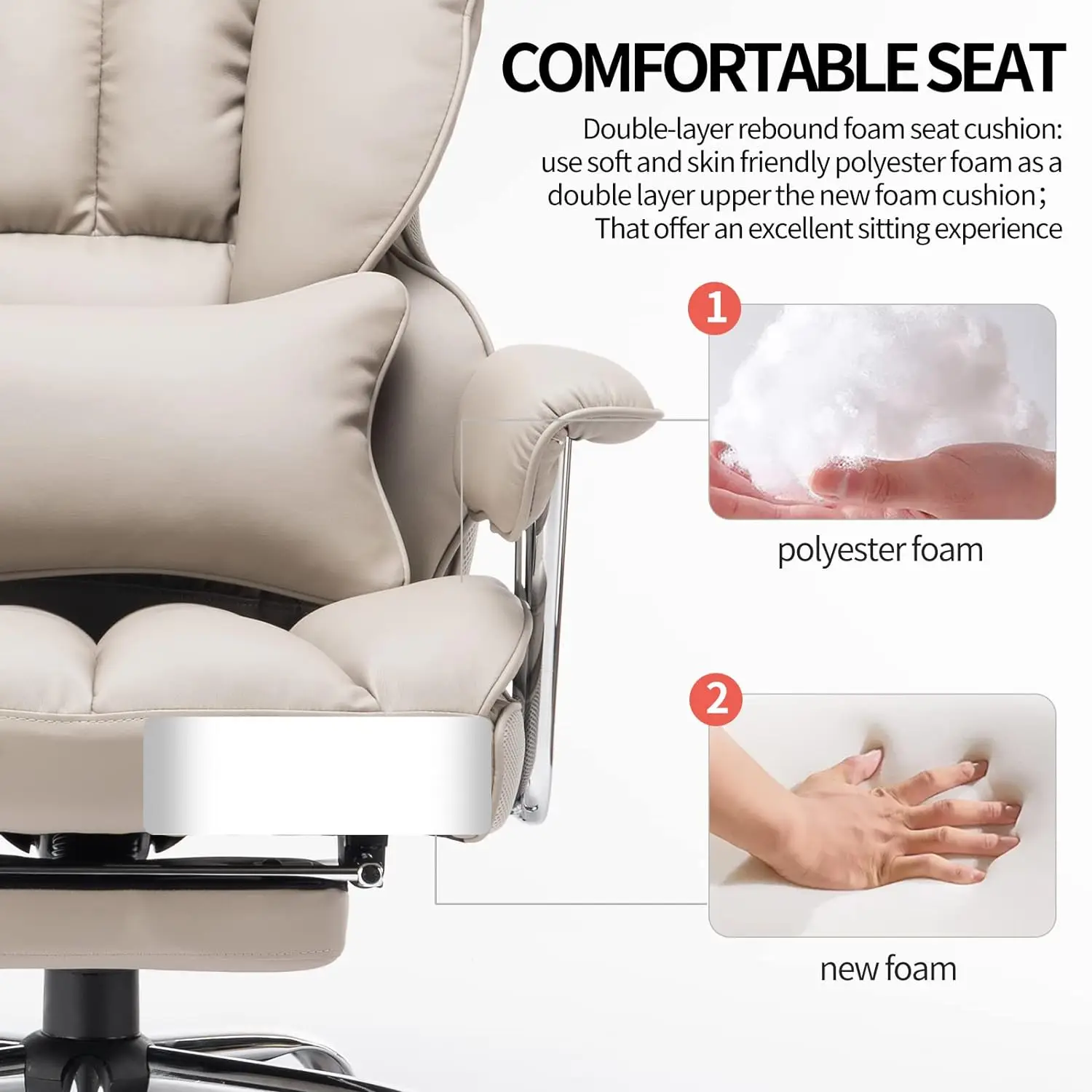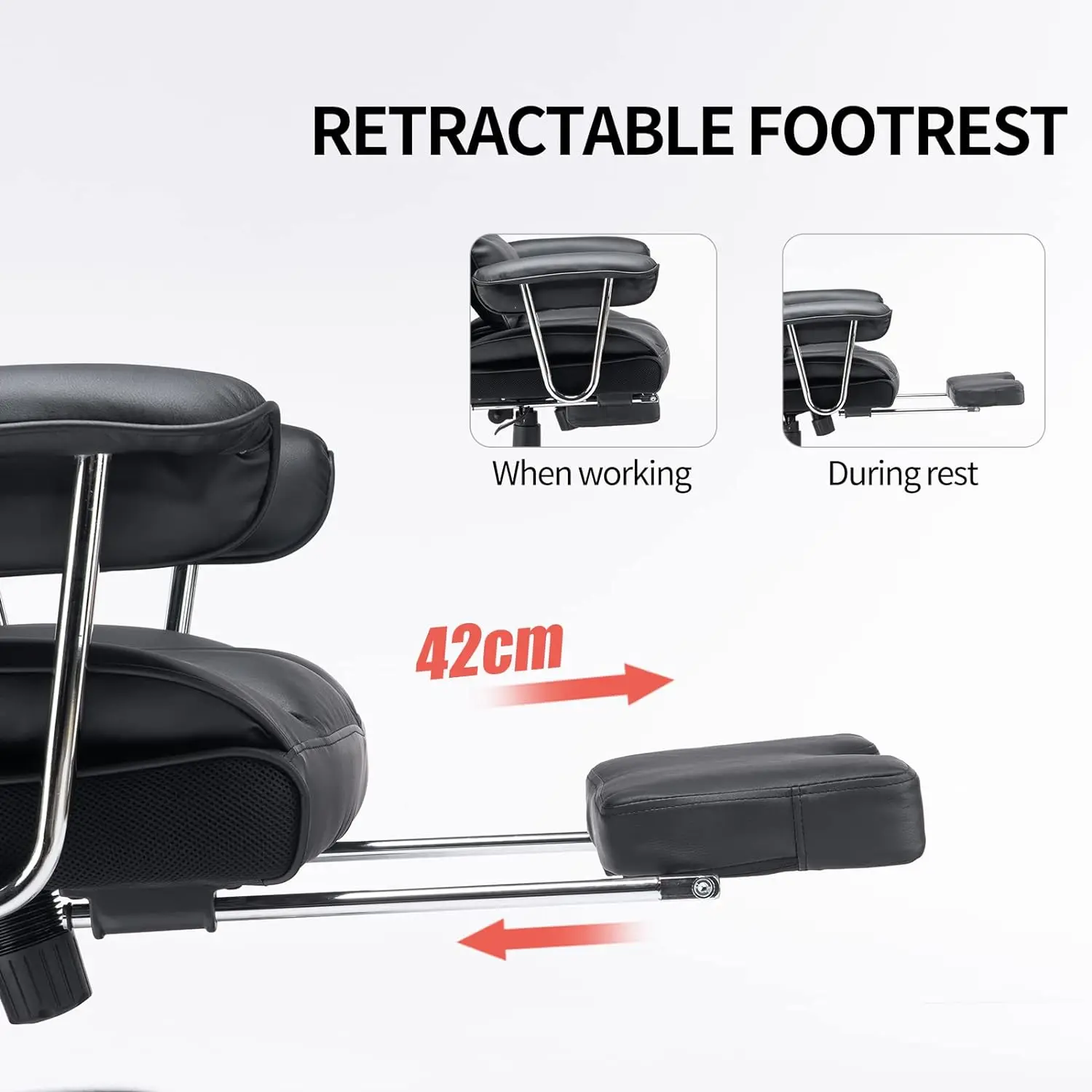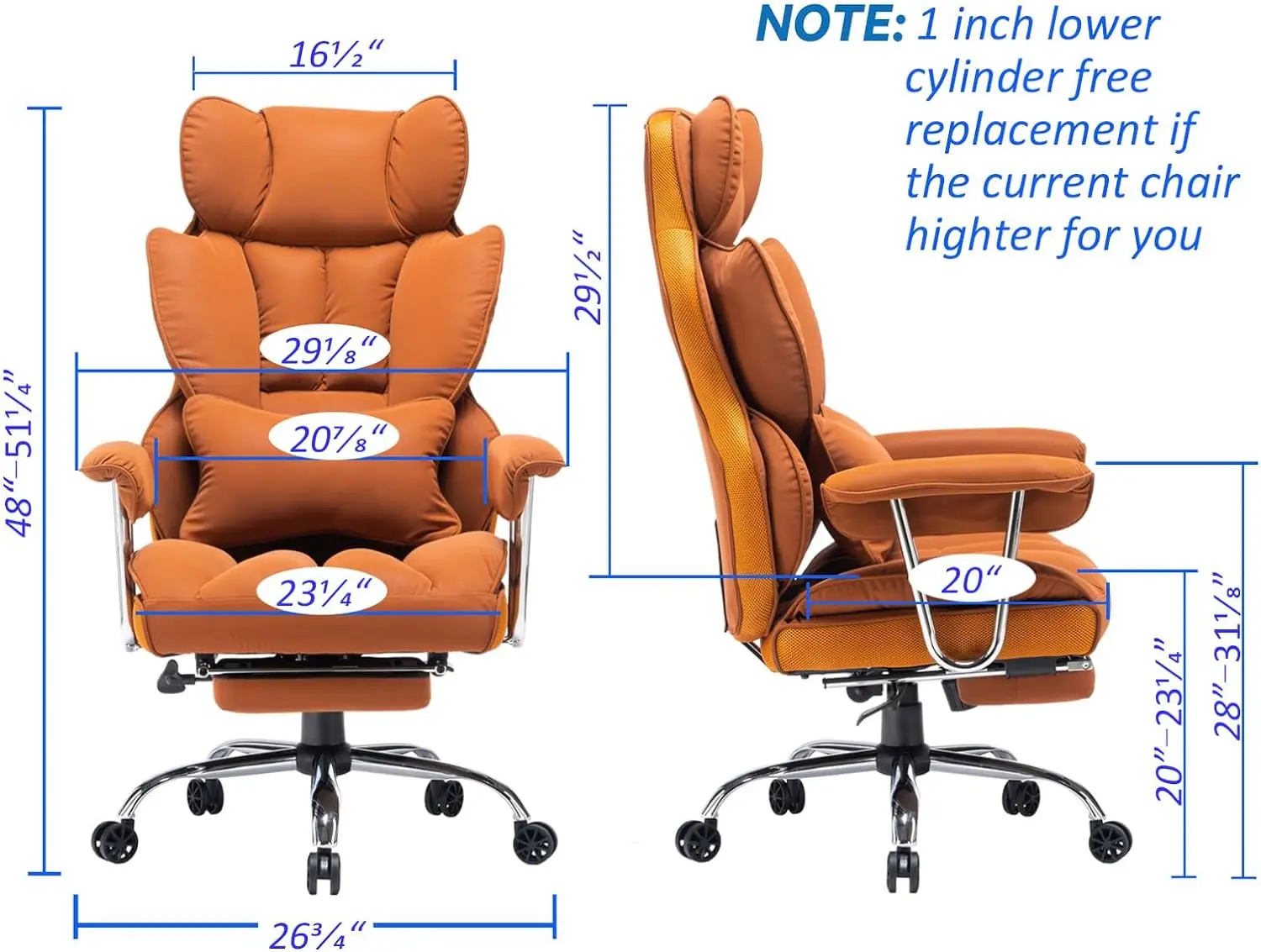 - COMFORTABLE OFFICE CHAIR - The ergonomic office chair equip a dual-layered sponge seat cushion. The big office chair backrest and independent lumbar support gently wrap around your body ,support your lower back, thoughtfully designed for the big and tall office chair to keep you comfortable during long hours of working, studying, or gaming. The leather office chair provides unparalleled comfort. Moreover, this executive chair with leg rest adds an extra dimension of relaxation to your workspace