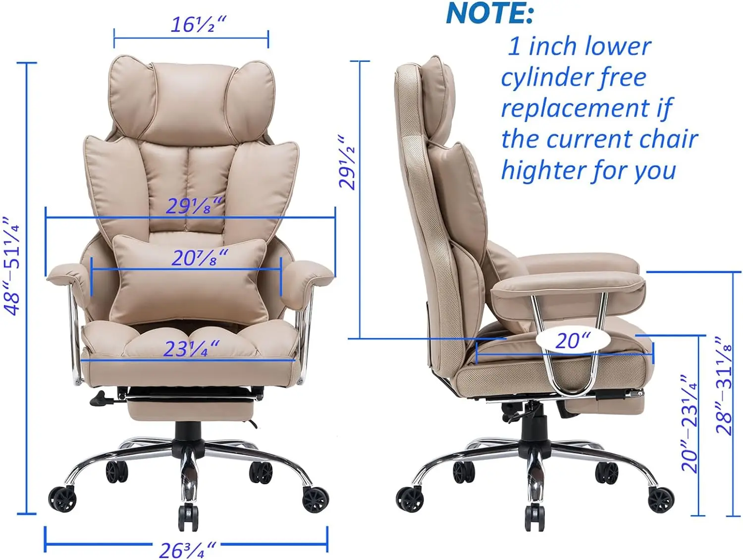 - HEAVY-DUTY LEATHER OFFICE CHAIR- The big and tall office chair, featuring a heavy-duty metal base, is designed to accommodate individuals weighing up to 400lbs. The comfy office chair boasts a big high back chair design and is upholstered in leather, providing both style and comfort. The executive office chair is equipped with an oversized seat cushion (seat size: 20"D X 23.2"W, 4" thick), ensuring ample space and support