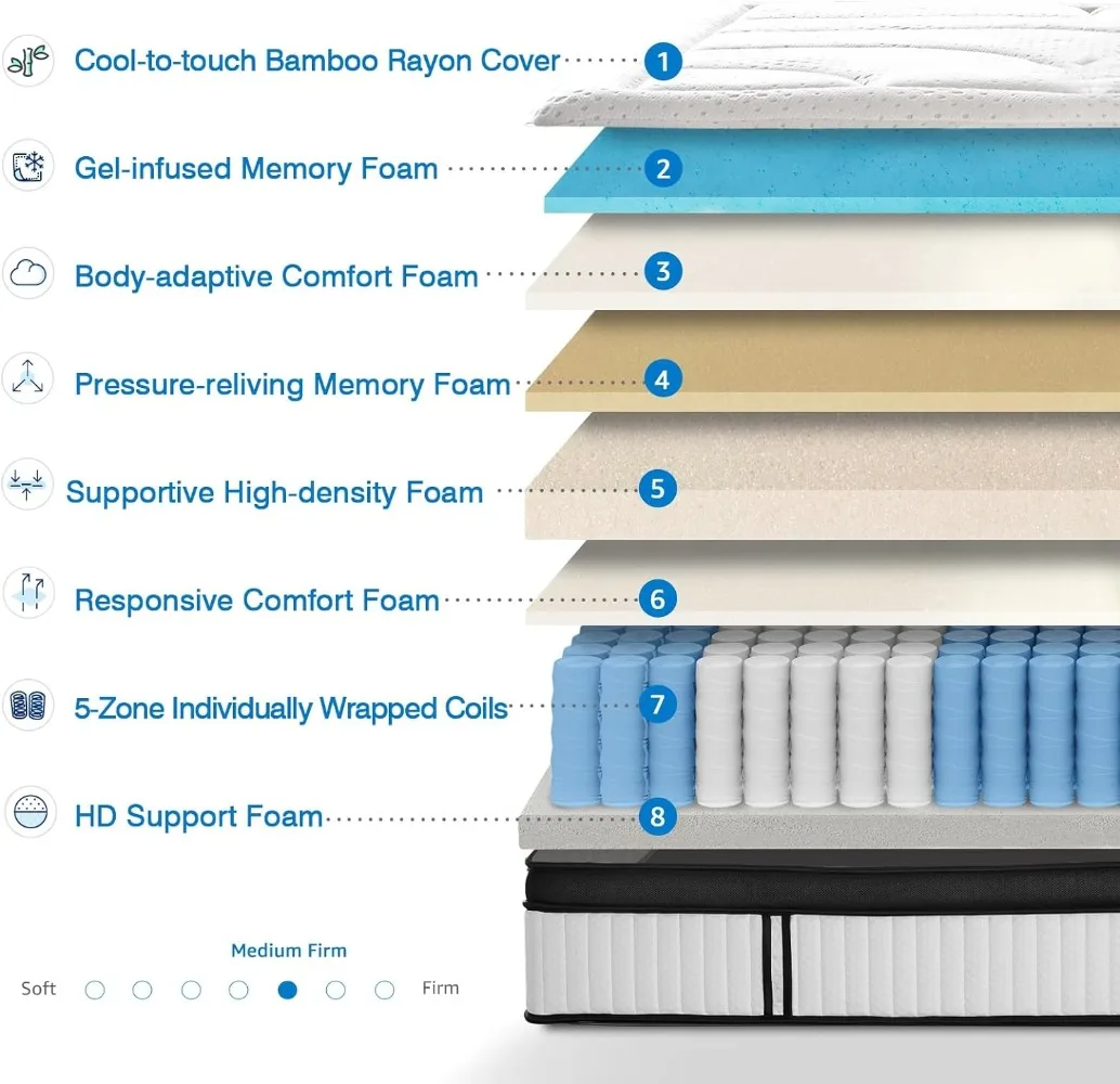 King Mattress, 14 Inch Hybrid Gel Memory Foam and Innerspring Mattress, Euro Top Luxury Mattress with 7 Premium Layers