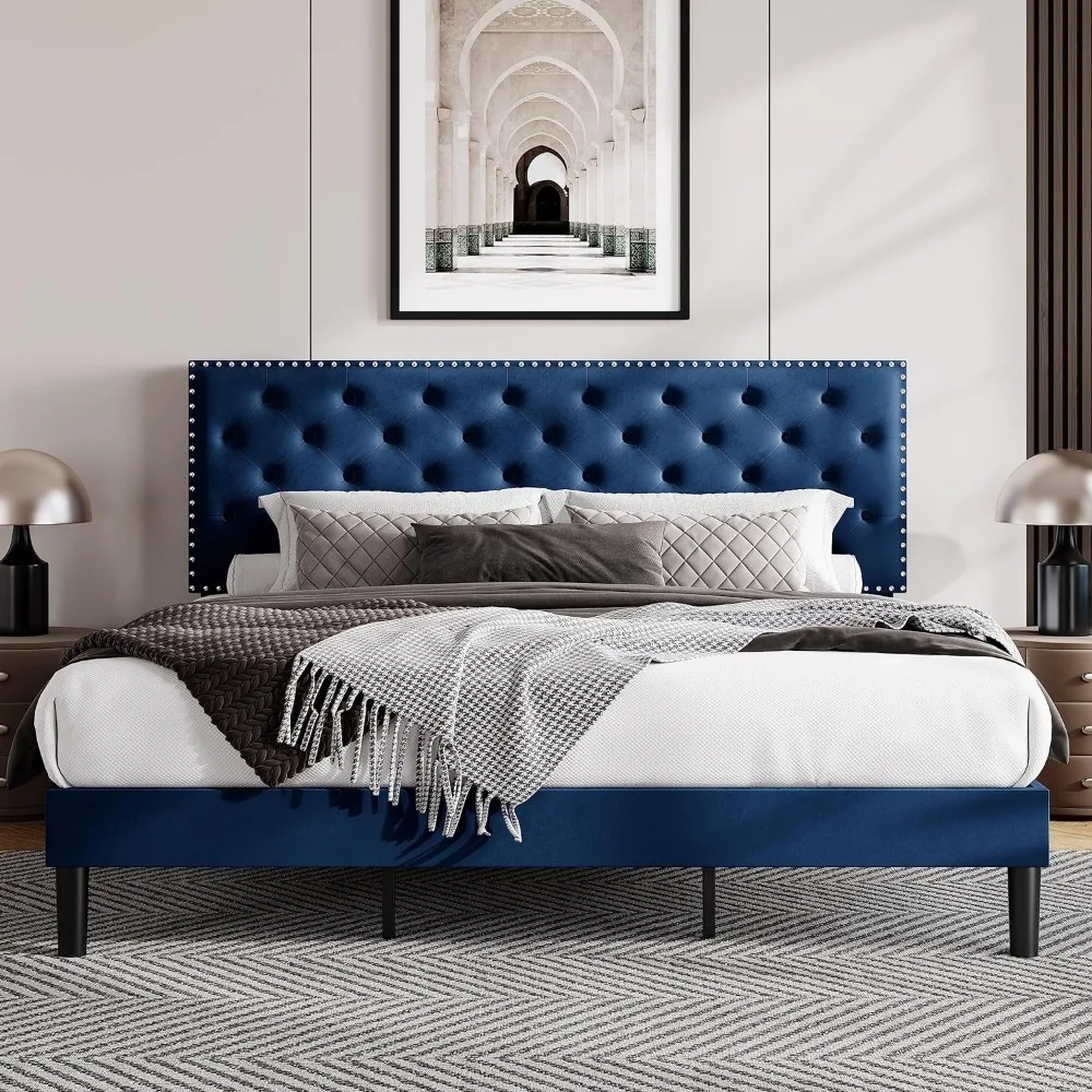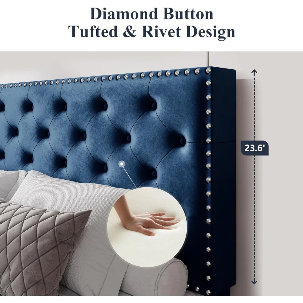 King size bed frame, velvet padded platform bed with adjustable diamond button tufting and nail head decoration headboard, bed