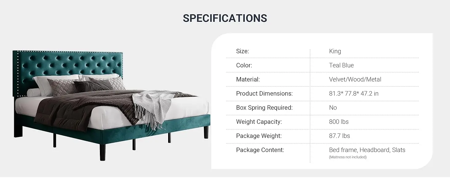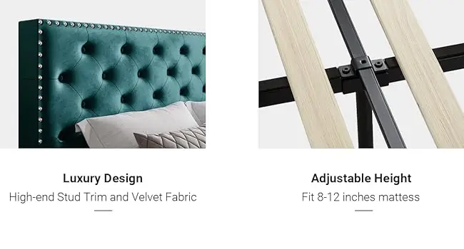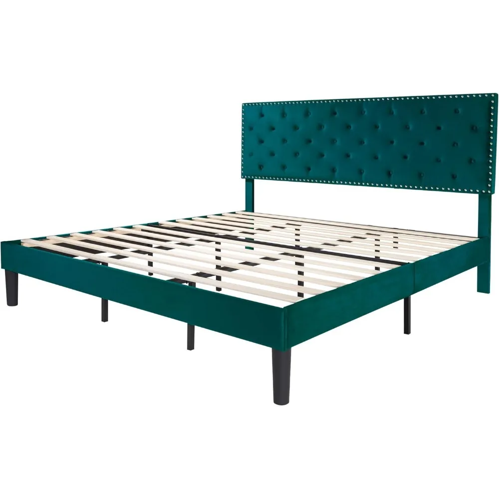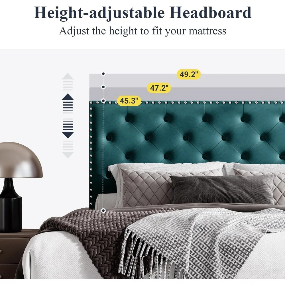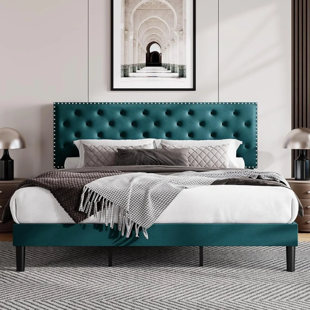 King size bed frame, velvet padded platform bed with adjustable diamond button tufting and nail head decoration headboard, bed