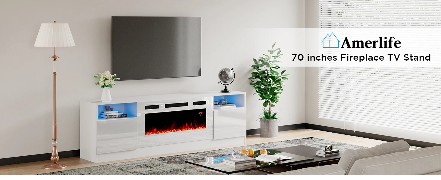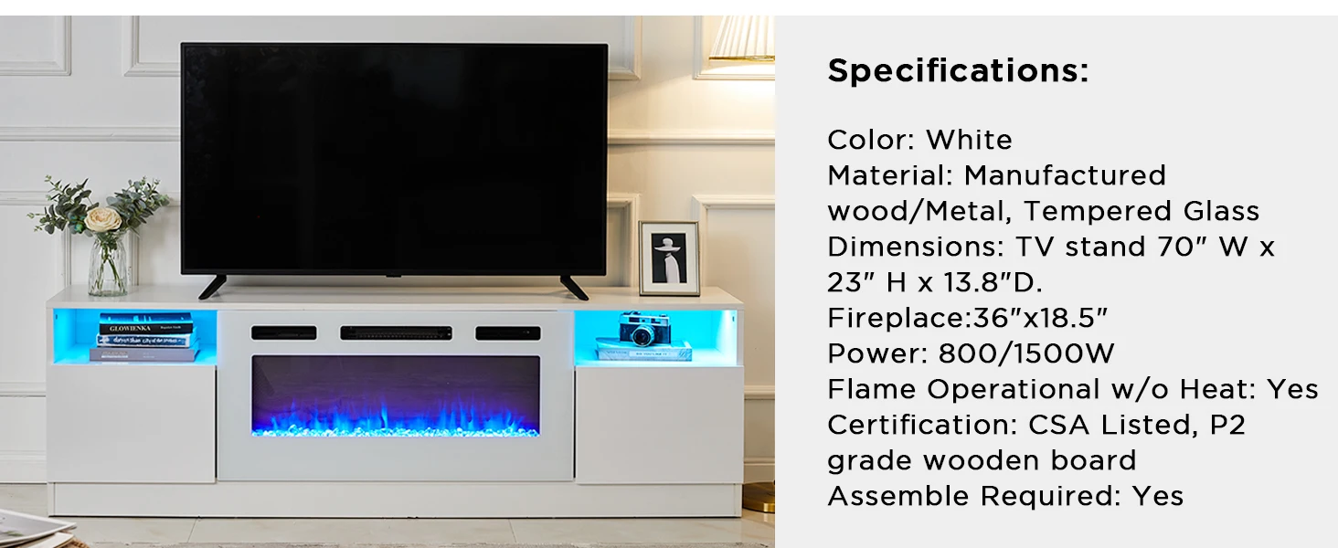 • Overall Dimensions: 70" W x 23" H x 13.8"D. For flat curved screen TV up to 80 inches. Electric fireplace: 36"x18.5". 750W/1500W modes perform adjustable power capacity accordingly for both warm and energy-saving purposes.