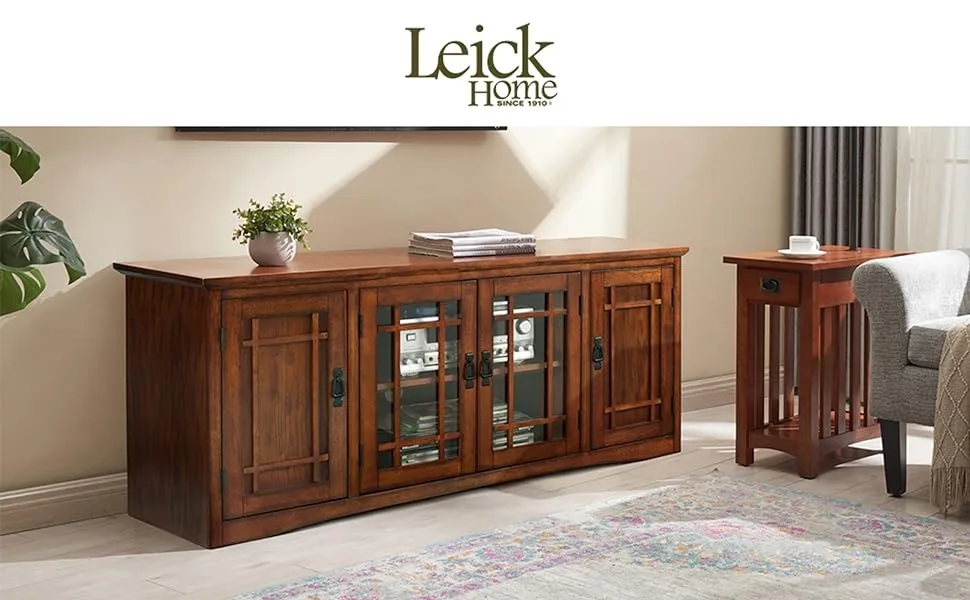 The Leick Home Solid Wood Mission Oak TV stand incorporates the best elements of mission design, blackened hardware on column backplates, and of course, a rich, mission oak finish to embellish the beautiful oak wood. Sturdy North American hardwood construction makes this a piece that can be handed down for generations. This living room entertainment center holds up to a 65" TV. Simple and sturdy, unfolding assembly, self-closing door hinges, and wire-management perforations on the back make it easy to live with as well. Designed and manufactured by Leick Home, the trusted source for quality home furnishings for every taste and budget.