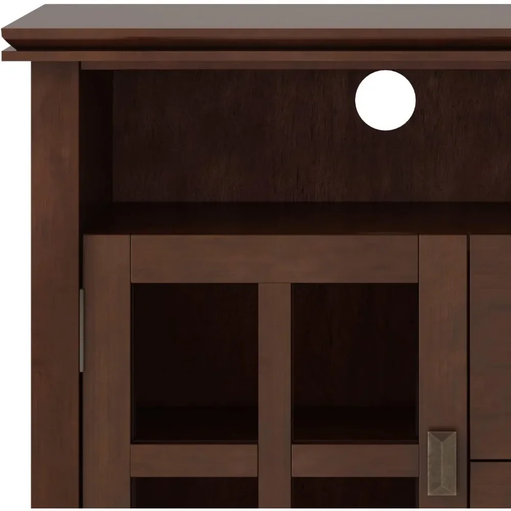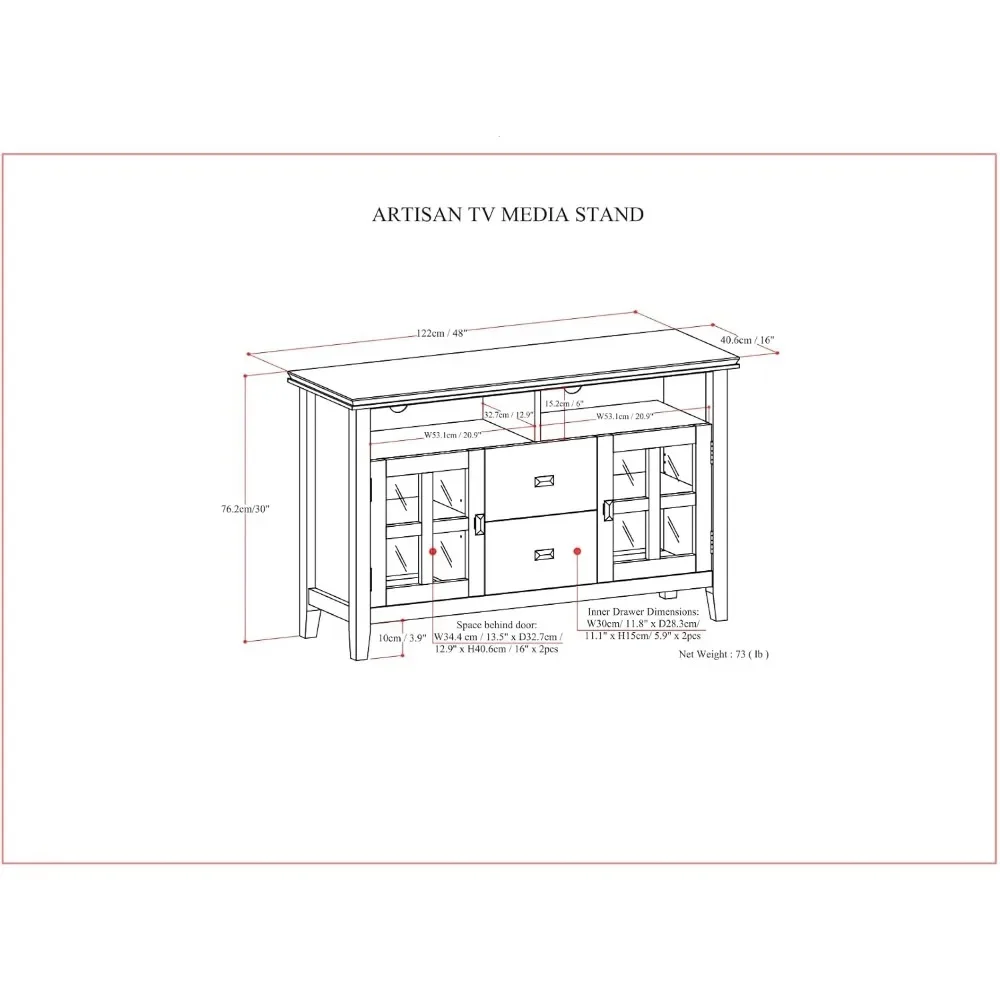 • Features two (2) central drawers with metal glides, open center area with adjustable shelf and two (2) side tempered glass framed doors that open to large storage spaces with two (2) shelves each