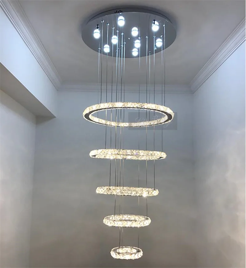 Large Luxury Crystal LED Chandelier Lighting Fixture 5 Rings Circle LED Crystal Pendant Hanging Lamp Stair Hall Dimming Lustres