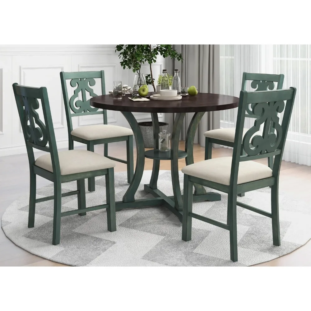 Product Name | 5-Piece Round Dining Table and 4 Fabric Chairs with Special-shaped Table Legs and Storage Shelf (Antique Blue/ Dark Brown) |
