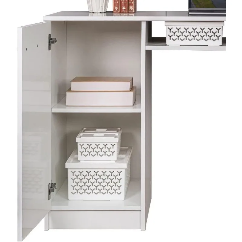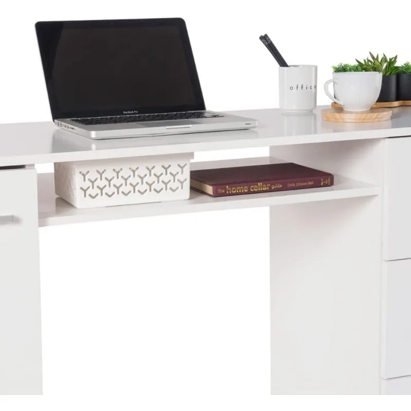 • FEATURES: Accomodates 2 monitors, with 3 Drawers, 1 cabinet and 1 storage shelf under the desk top you can easily organize your working stuffs, this desk has no paint finish at the back and Supports up to 66 lbs - 30 Kg