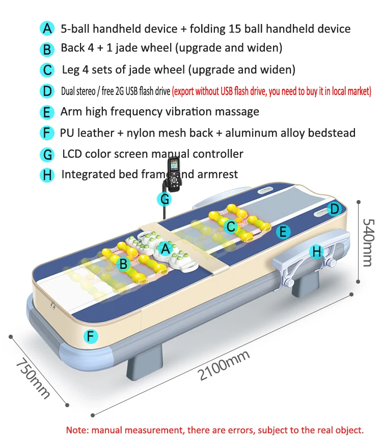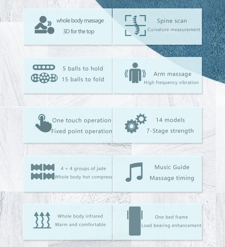 1) The massage machine adopts S-shaped aluminum alloy integrated track, high-grade leather, strong bed frame, fine technology;