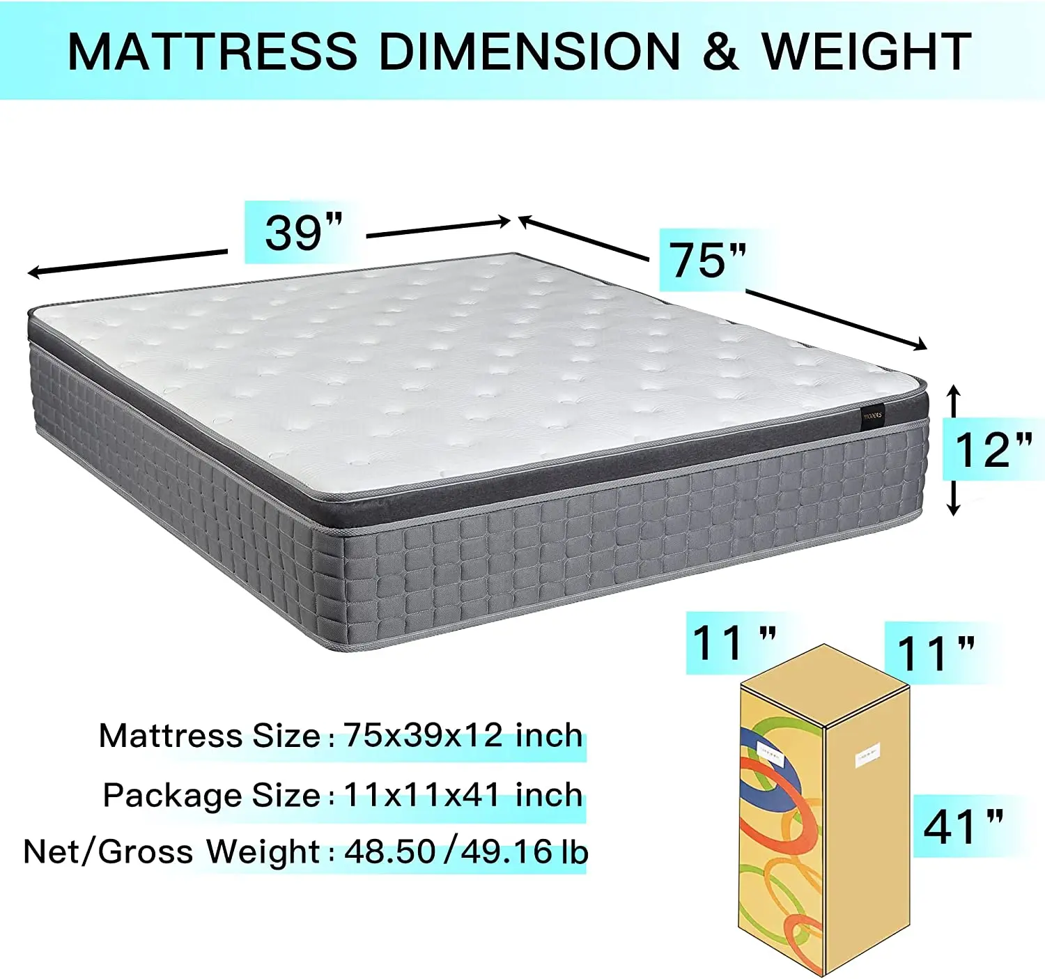Twin: 75 x 39 x 12 Inch / 48.5 lb