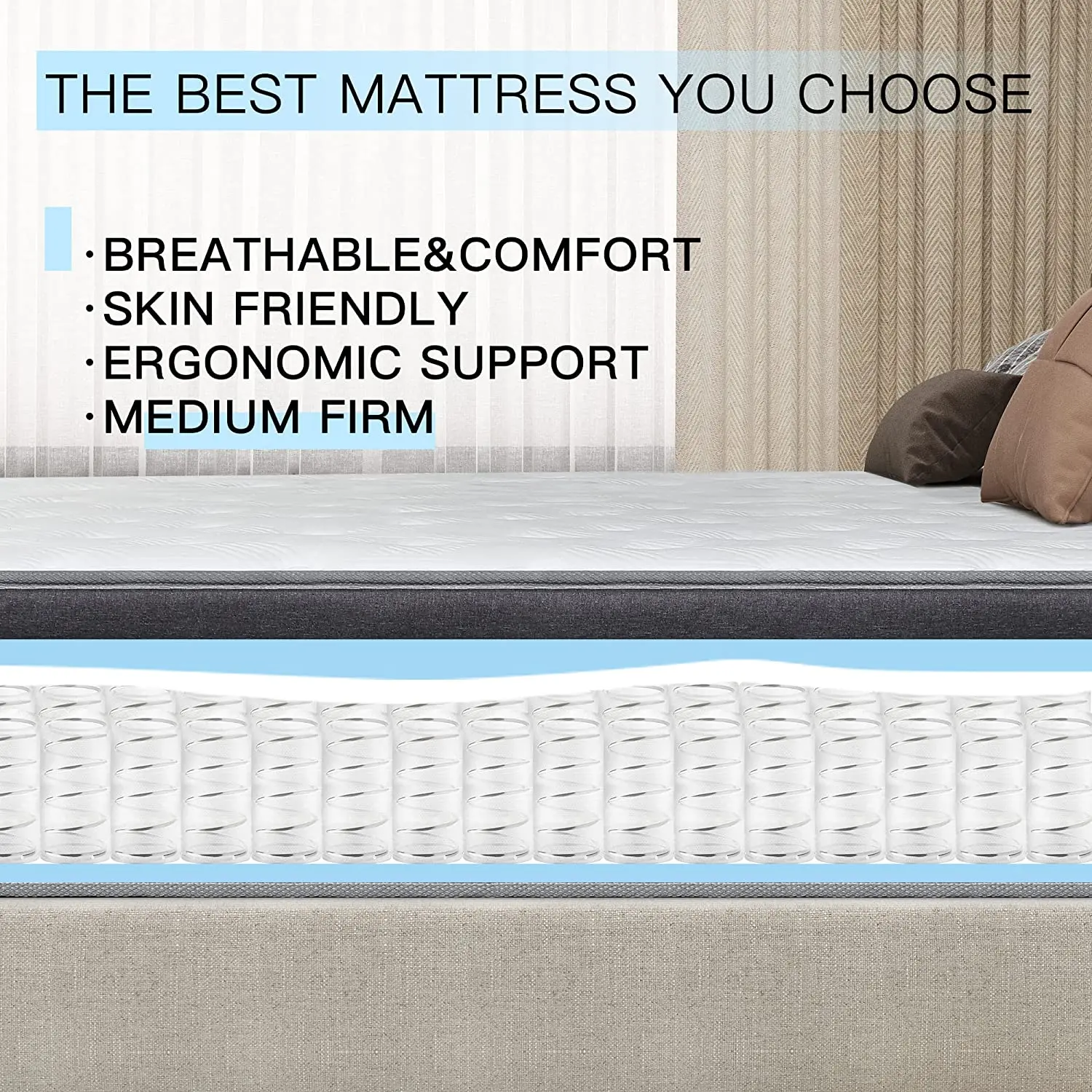 The MICOOLS Mattress has been designed using sturdy inner pocket-spring construction finished with several layers of high-density foam. The unique 7-zone design of the mattress provides both pressure-relief and support. To make it better, we use independent pocket spring with 6-turn coils that lasts longer due its shape and structure, while the upper foam layers have been designed to adjust to the body and provide a customized and relaxing sleep surface. The luxury breathable top with high quality knitted jacquard fabric helps to keep the mattress cool and dry.