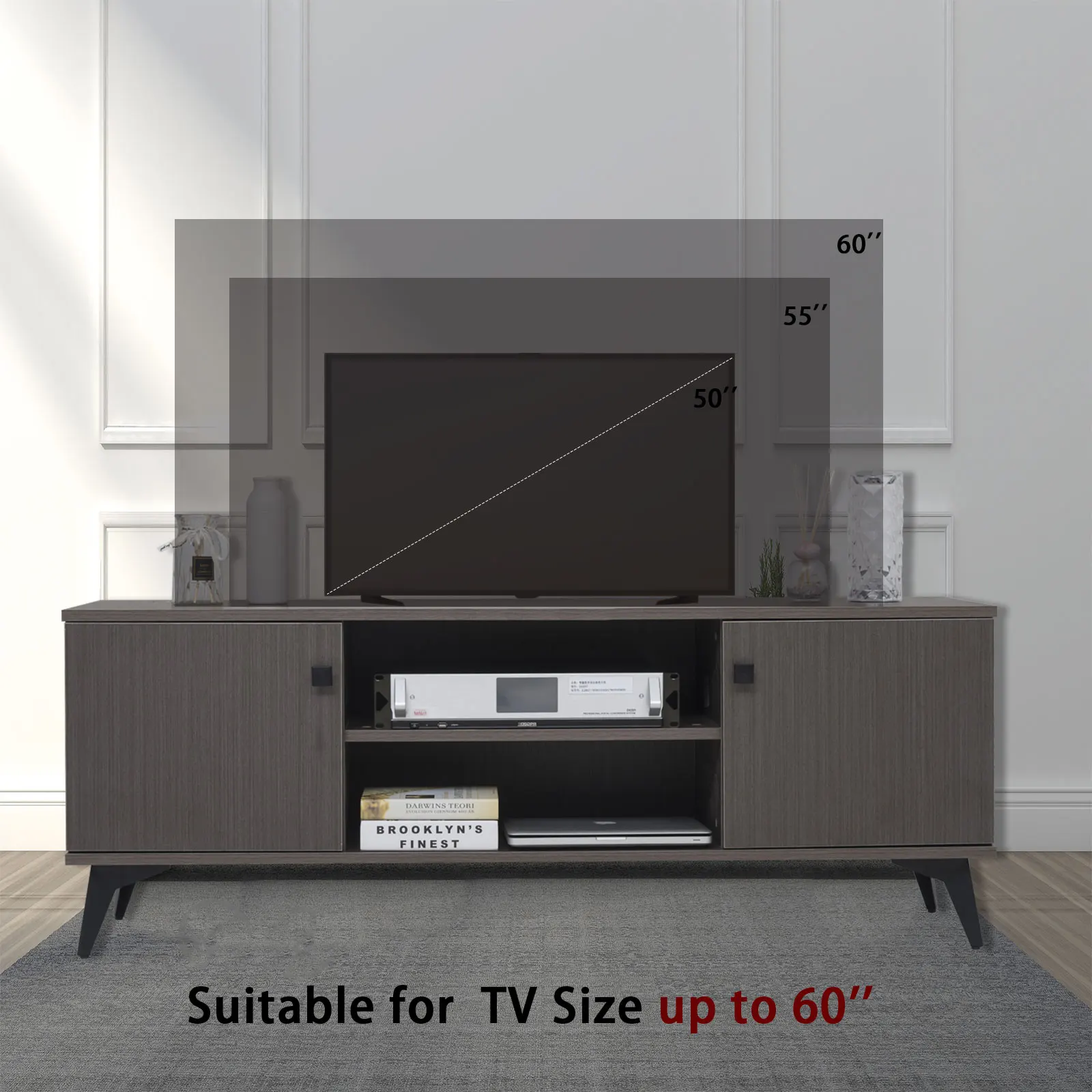 [PROPER SIZE] Overall dimension:57.87"*15.35" *21.6" in. This TV entertainment center fits 50/55/60inch TVs.