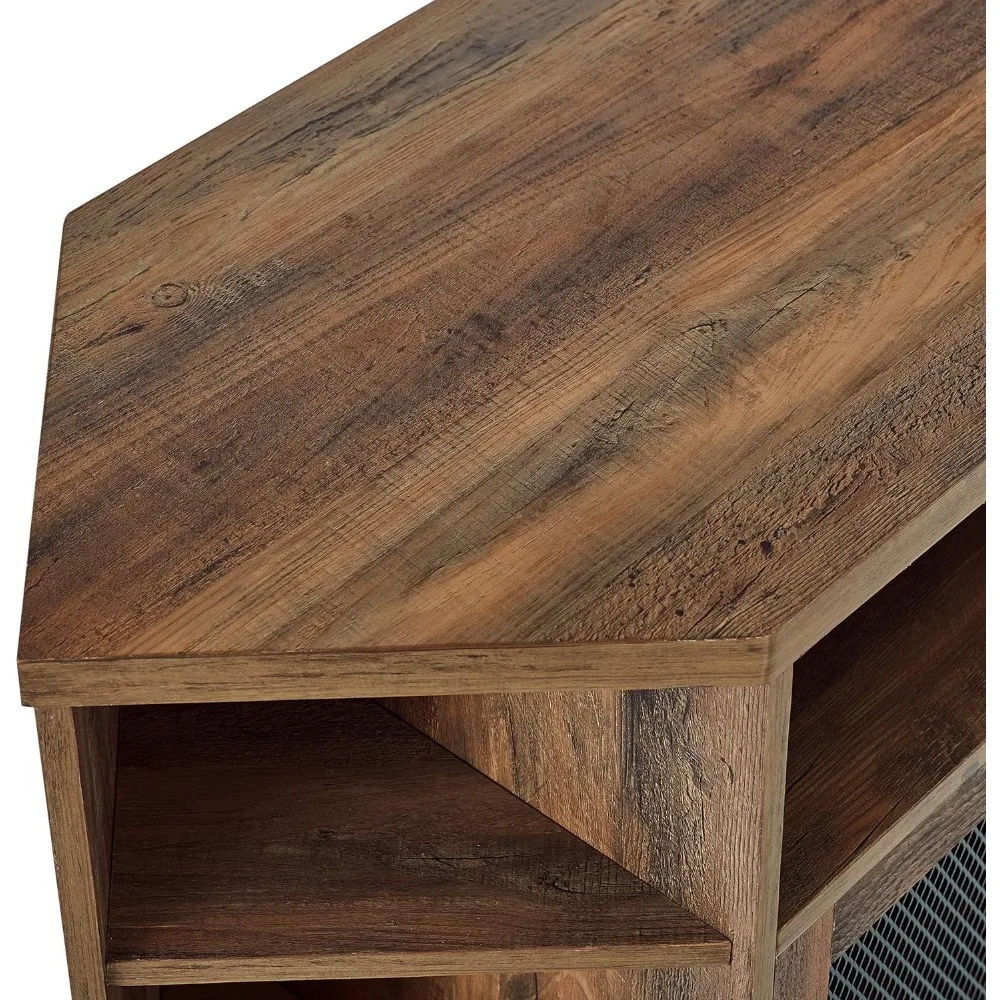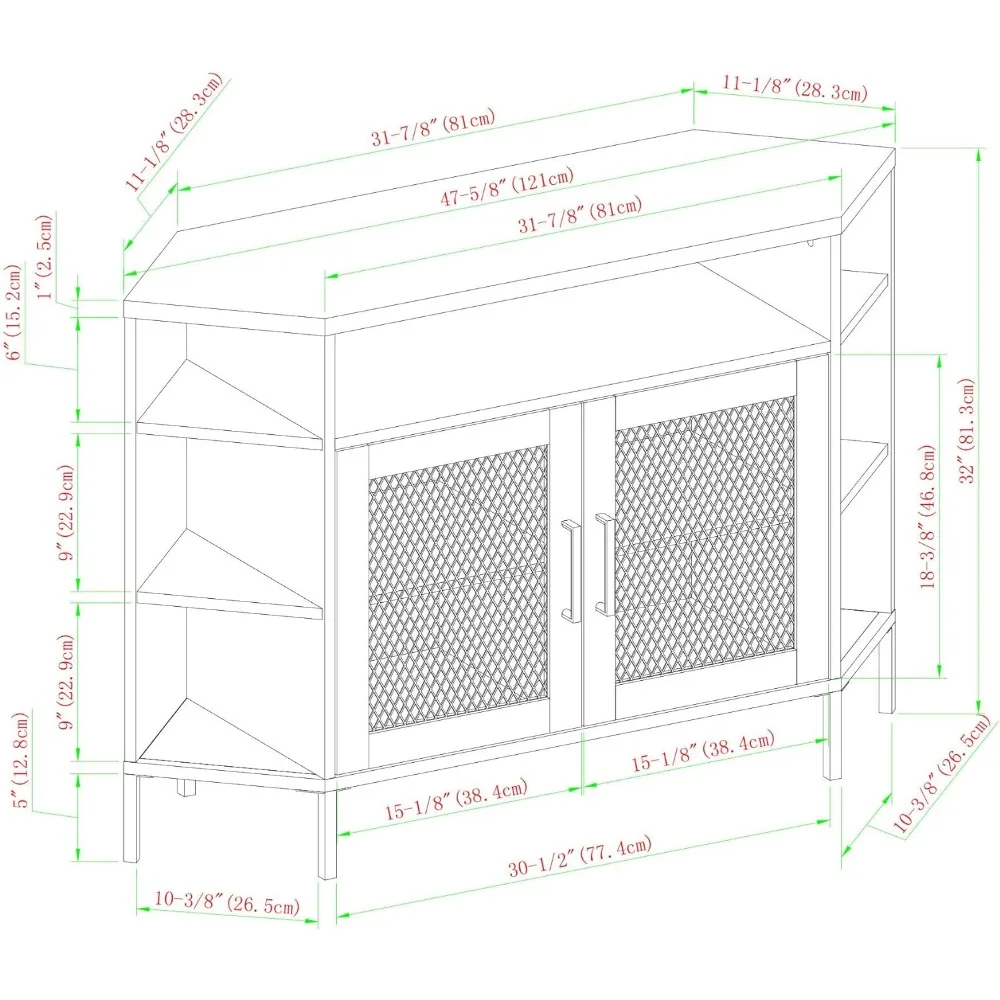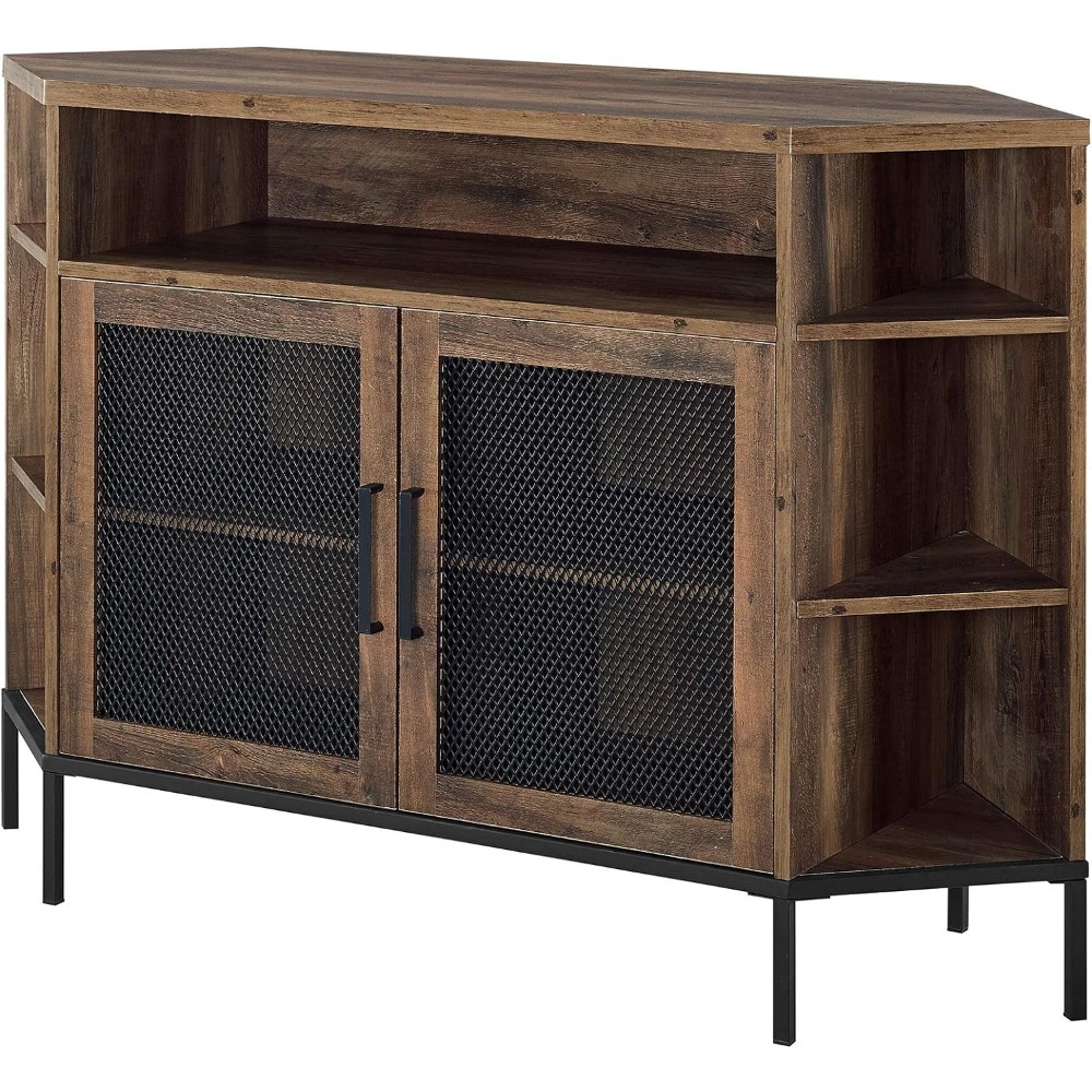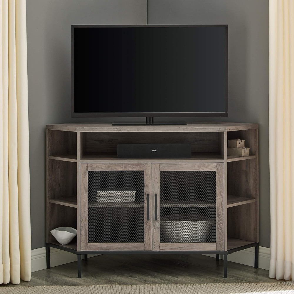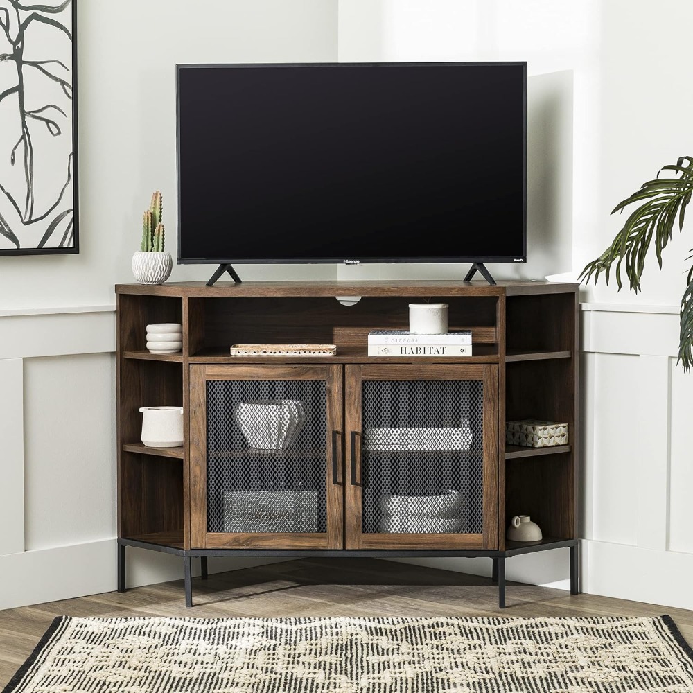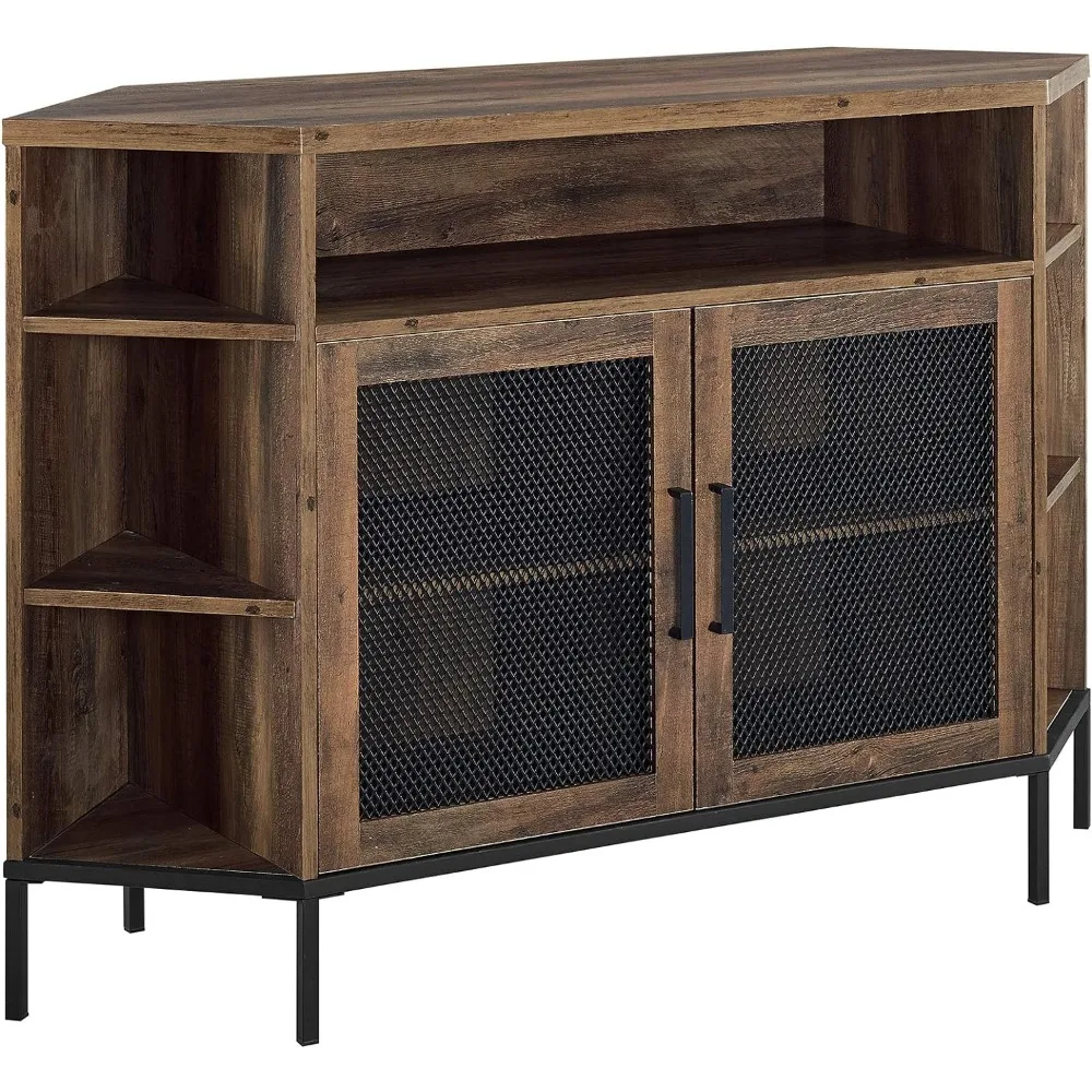 Modern Metal Mesh and Wood Corner Universal TV Stand with Open Shelves Cabinet Doors Storage 48 Inch, Rustic Oak