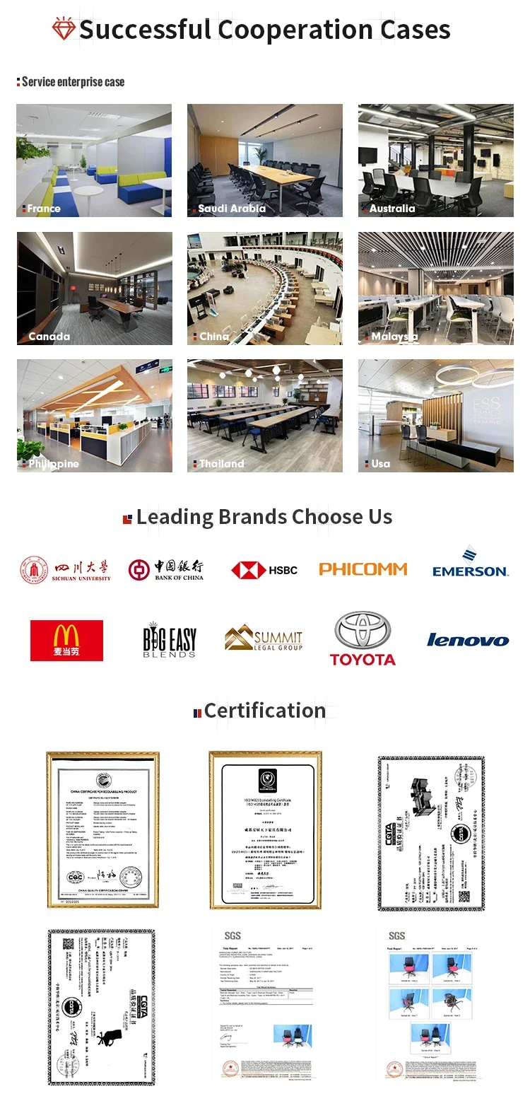 1.CATEGORY--We focus on Commercial furniture especially office furniture; 2.EXPERIENCE--Our factory have over 10 year manufacturing experience, Our craftsman have over 30 years experience; 3.SERVICE&STRENGTH-Customization service,one stop office furniture solution. 4.DELIVERY TIME- Stock products delivery within 3 working days; customization products delivery within 15 days; 5.LOGISTIC SOLUTION-By sea LCL,20FT 40HQ.to port,to door. 6.REQUIREMENT-We hope to know more detail about your requirement including timeline, layout, material and dimension,quantity ,we would like to help you make your ideal products and proposal for the solution. Please free feel to contact us!