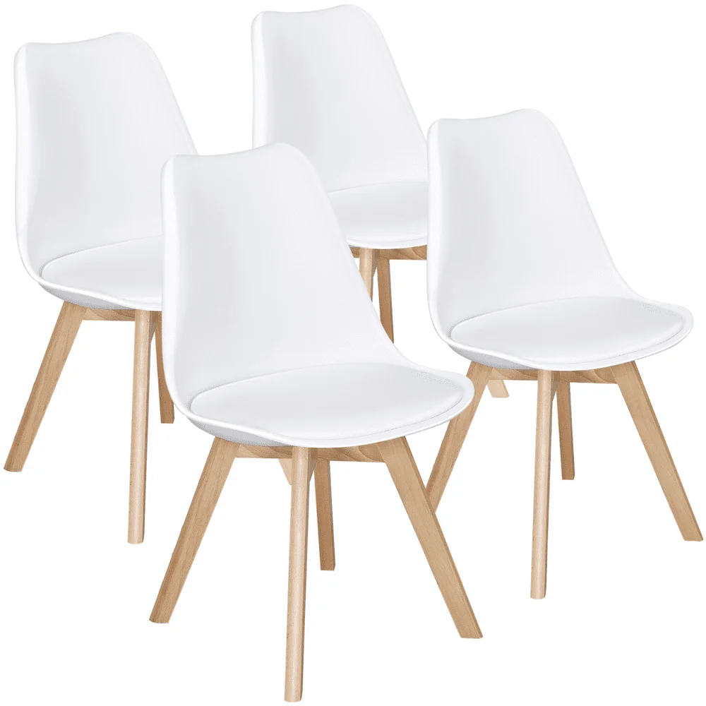 This set of four dining chairs are popular because of their versatile color and beech wood legs. They are stylish, modern, and perfect for a range of home decor styles. The seat and the backrest are molded in one piece, which makes the chairs durable, good-looking and comfortable. To improve the comfort, the backrest is designed in a curved shape so you can sit for long hours. This set of four is perfect for any living room, kitchen, sitting room, porch, balcony, office, etc. The high quality materials are durable and sturdy, guaranteeing they last a long time. For your safety, please do not stand on the chairs. The 32.1"H modern style kitchen chairs are equipped with protective pads at the bottom which are made from felt cloth. These pads protect the floor from being scratched and damaged.