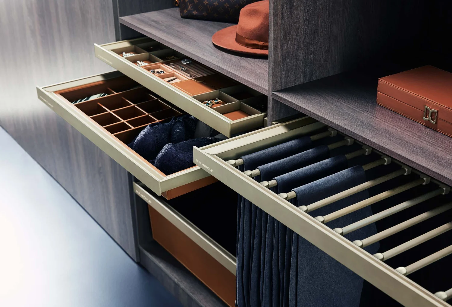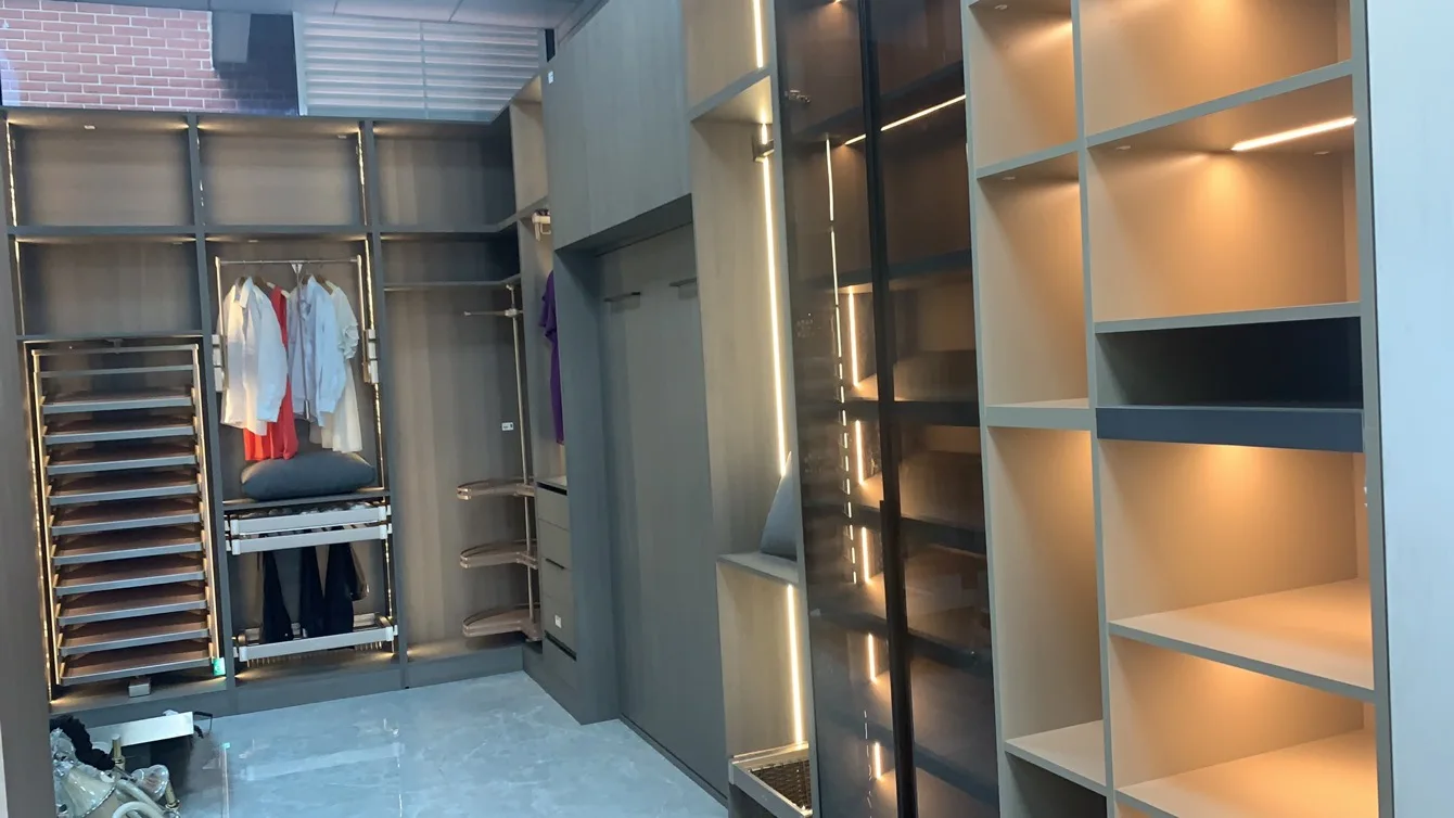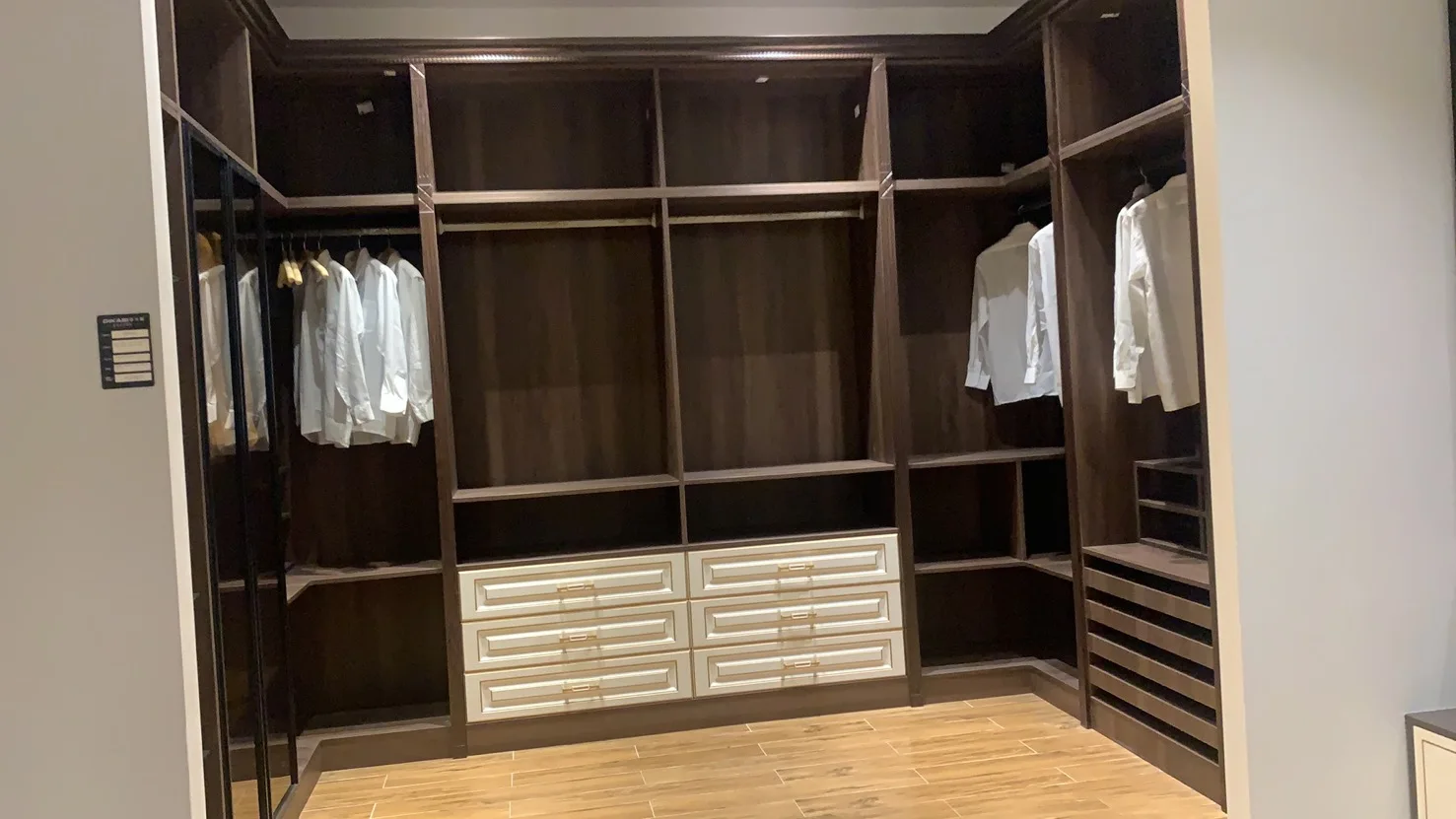 L Shaped Wood Grain Walk In Closet Of Best Bedroom Wardrobe with large shoe cabinet |