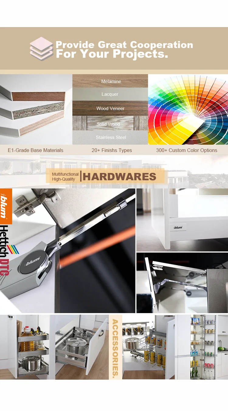 Backsplash, Drawer Basket, Drawer Slide, Faucet, Handle & Knob, Hinge, Rice Box, Sink, Toe Kick, Waste Container, Lazy Susan Storage |