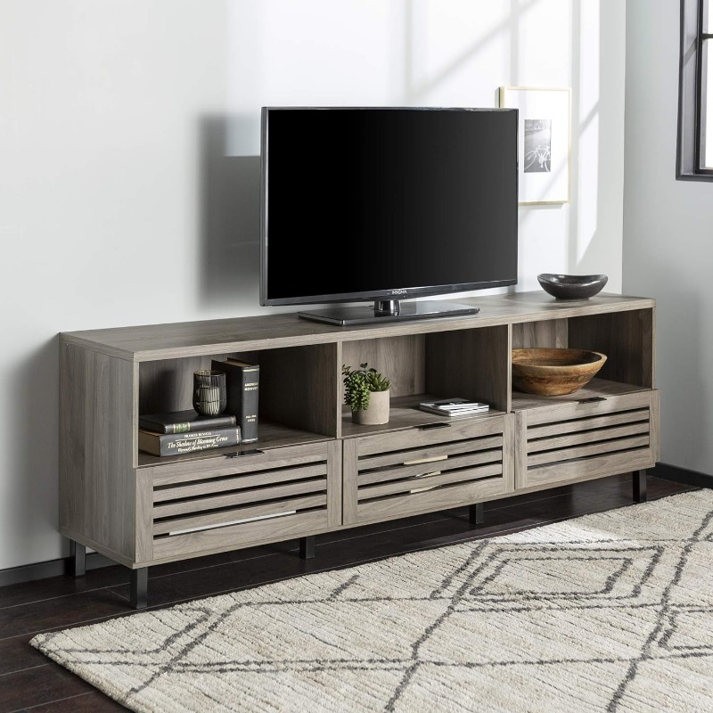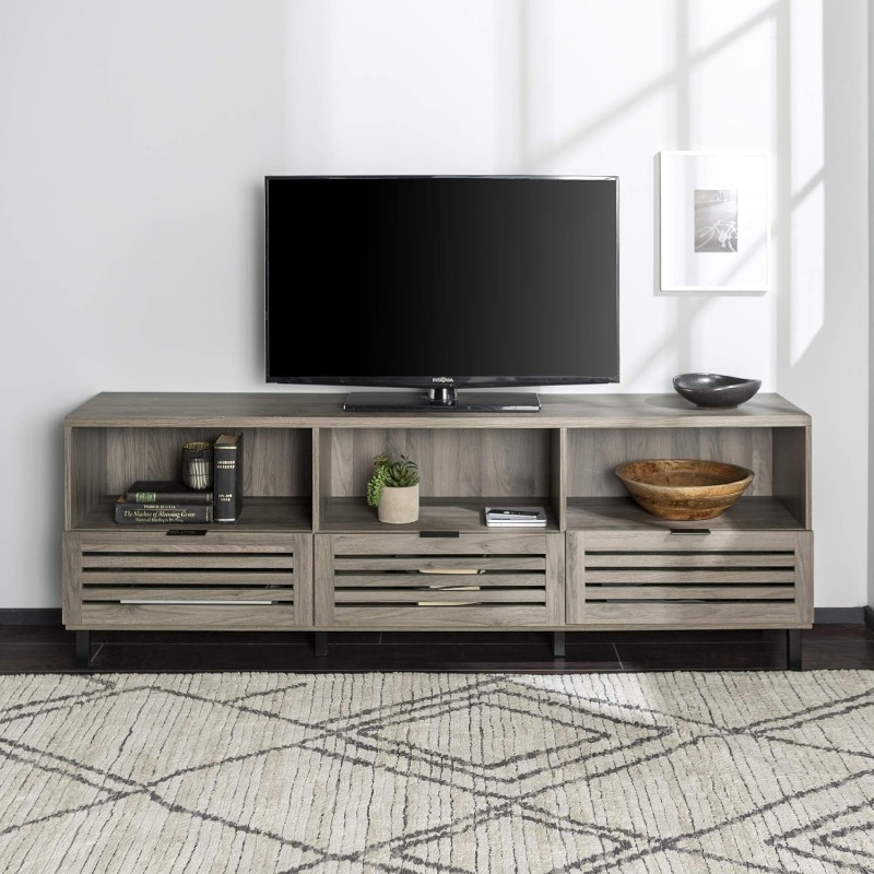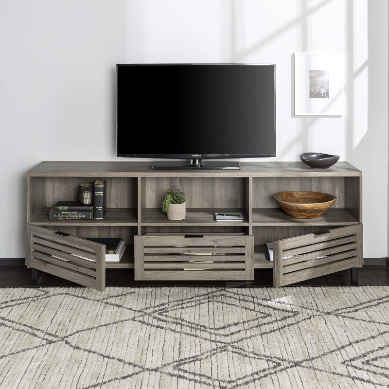 Modern Slatted Wood TV Stand for TV's up to 80" Universal TV Stand for Flat Screen Living Room Storage Cabinets and Shelves Entertainment Center, 70 Inch, Slate Grey