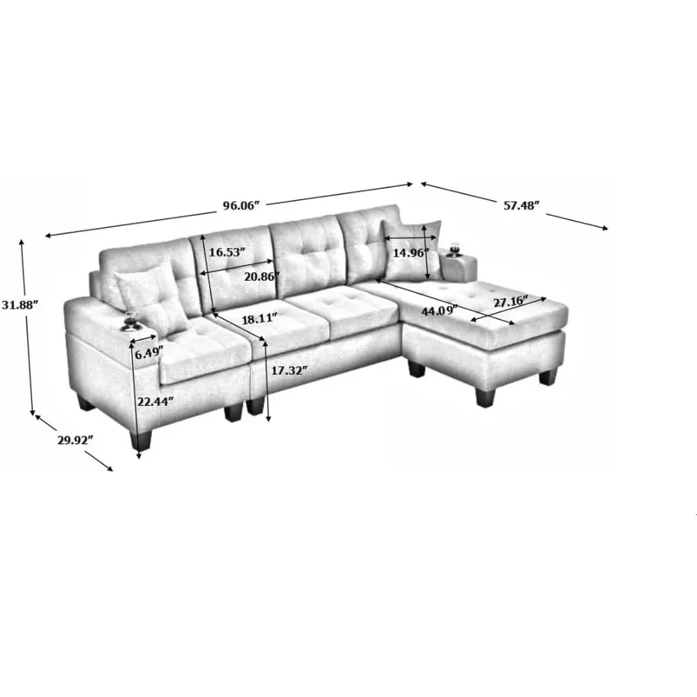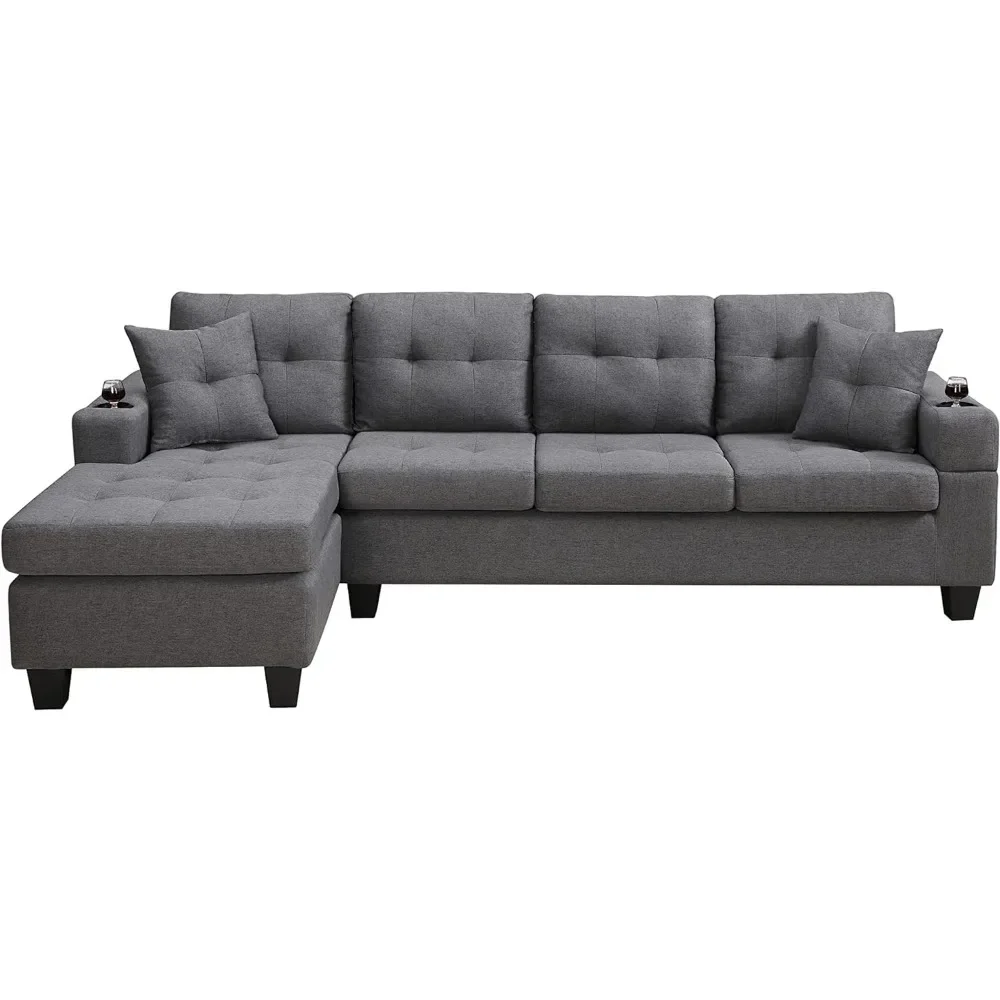 Modular Sofa with Double-sided Chaise Longue and Cup Holder, L-shaped 4-seat Sofa Furniture with 2 Pillows, Grey