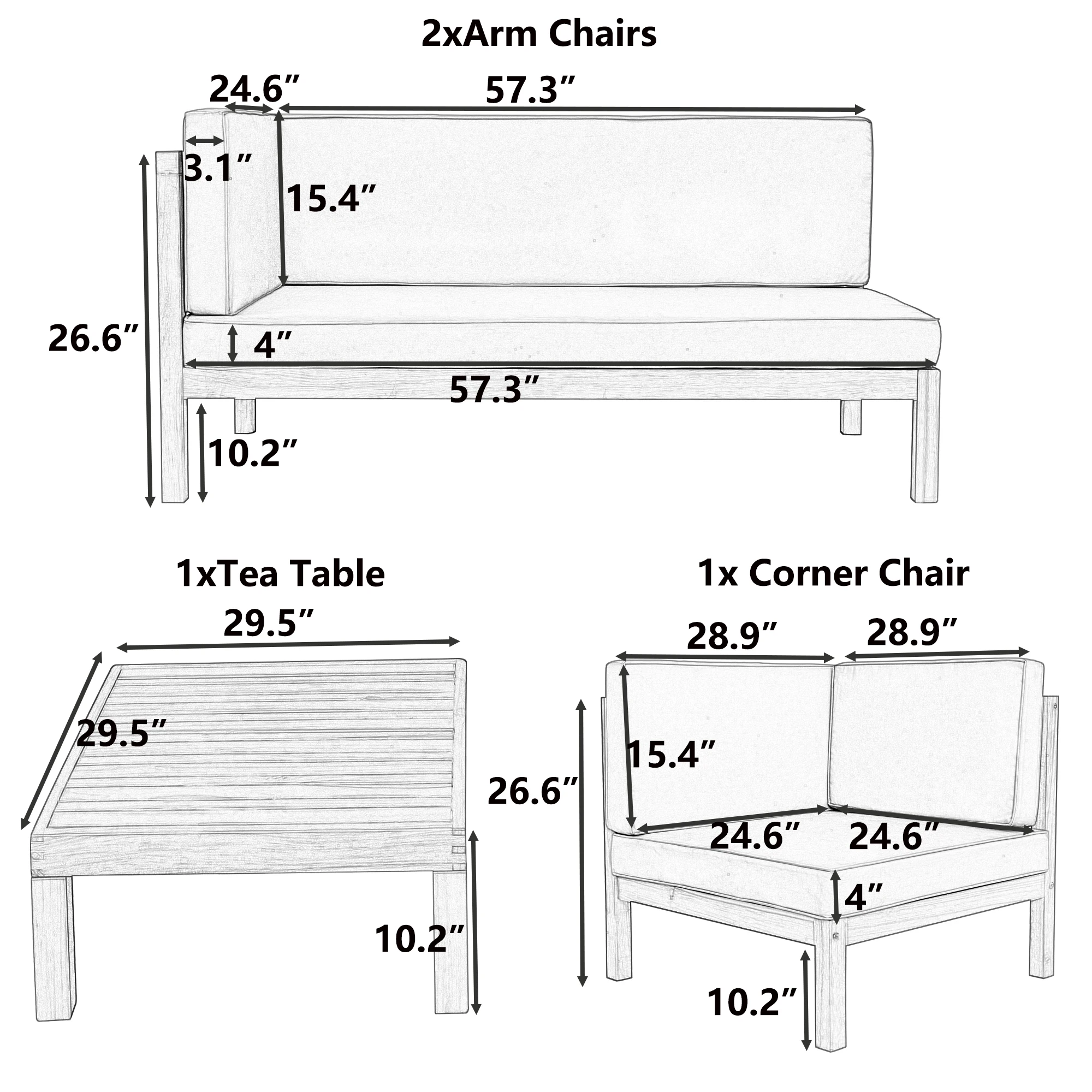 Arm Chair: 57.3x24.6x26.6inch(LXWXH); Corner Chair: 28.9x28.9x26.6inch(LXWXH); Tea Table: 29.5x29.5x10.2inch(LXWXH); Long Seat Cushion: 57.3x24.6x4inch(LXWXT); Long Back Pillow: 57.3x15.4x3.1inch(LXWXT); Arm Chair Pillow: 24.6x15.4x3.1inch(LXWXT); Corner Chair Seat Cushion: 24.6x24.6x4inch(LXWXT); Corner Chair Back Pillow: 28.9x15.4x3.1inch(LXWXT) |