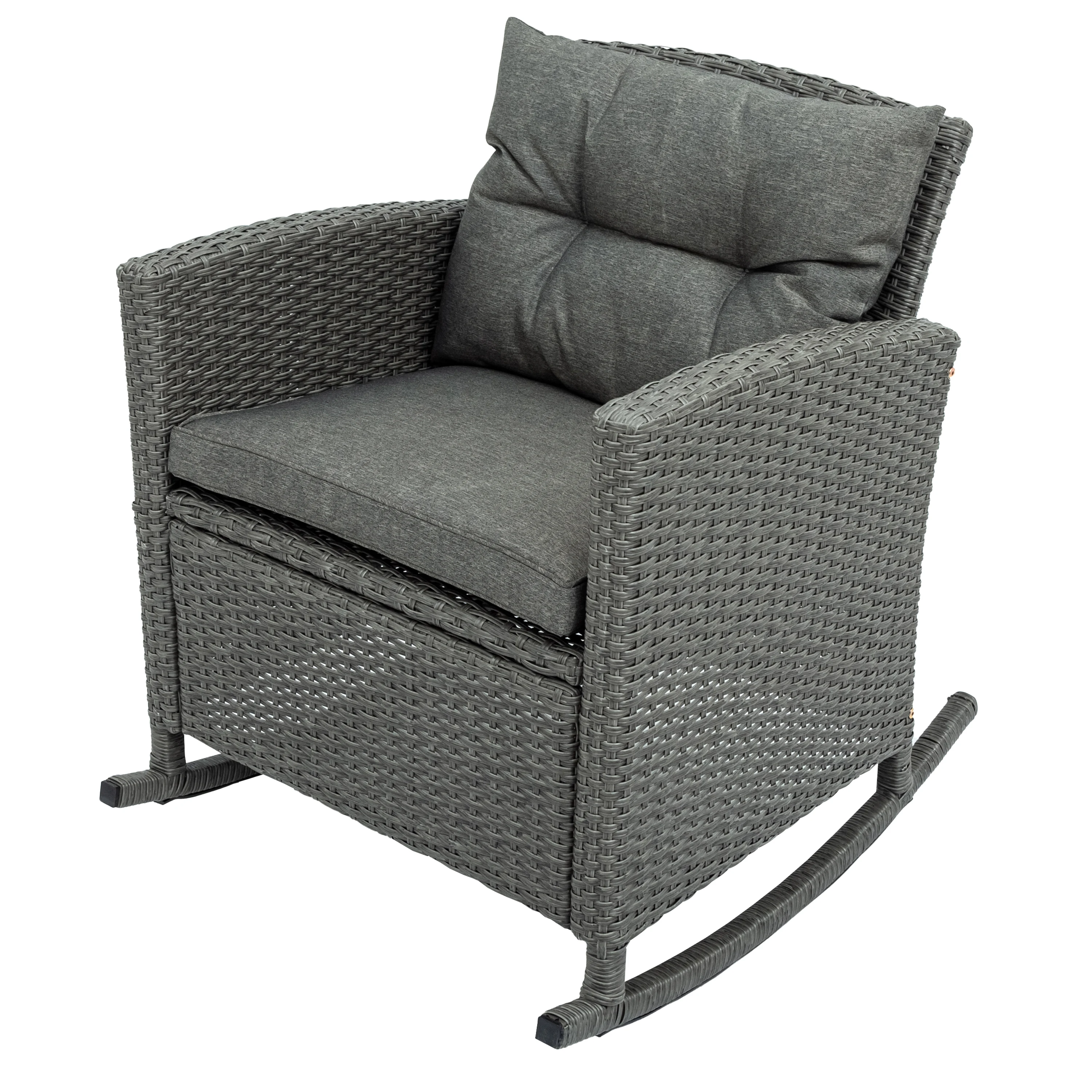 When it comes to enjoying leisure time outside, a space to feel relaxed and comfortable while you’re having a morning coffee, reading a book or catching a quick nap is necessary. This 3 Piece Rocking Patio Furniture Set can create such a space for you, a perfect setting for sharing the joys, enjoying natural scenes, or chatting with friends. Manufactured with all-weather PE rattan, the conversation set can be used outdoor to have a free time. Durable and sturdy powder-coated steel frame allow this patio set to withstand a maximum weight of 350 lbs, designed for people of any figure to rock comfortably while feeling safe and secure, makes the chair more stable but lightweight. Extra wide armrests and thick foam-padded cushions provide a better seating experience for you. The elegant tempered-glass table is perfect for you to enjoy food and couple glasses of wine. Widely used for outdoor patio, garden, lawn and balcony, enjoying rocking while exposing to the nature with this wicker rattan patio furniture set.