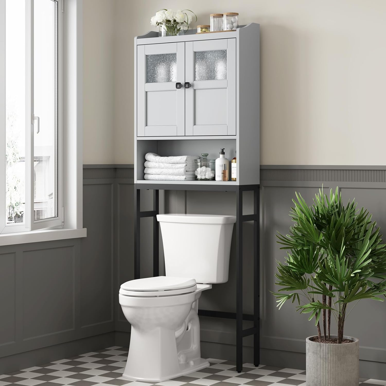 MXARLTR Over The Toilet Storage Cabinet, Bathroom Organizer Over Toilet Storage, Double Doors Over The Toilet Storage Soft Hinges Above Toilet Bathroom Storage Shelf Over-The-Toilet Storage (Gray)